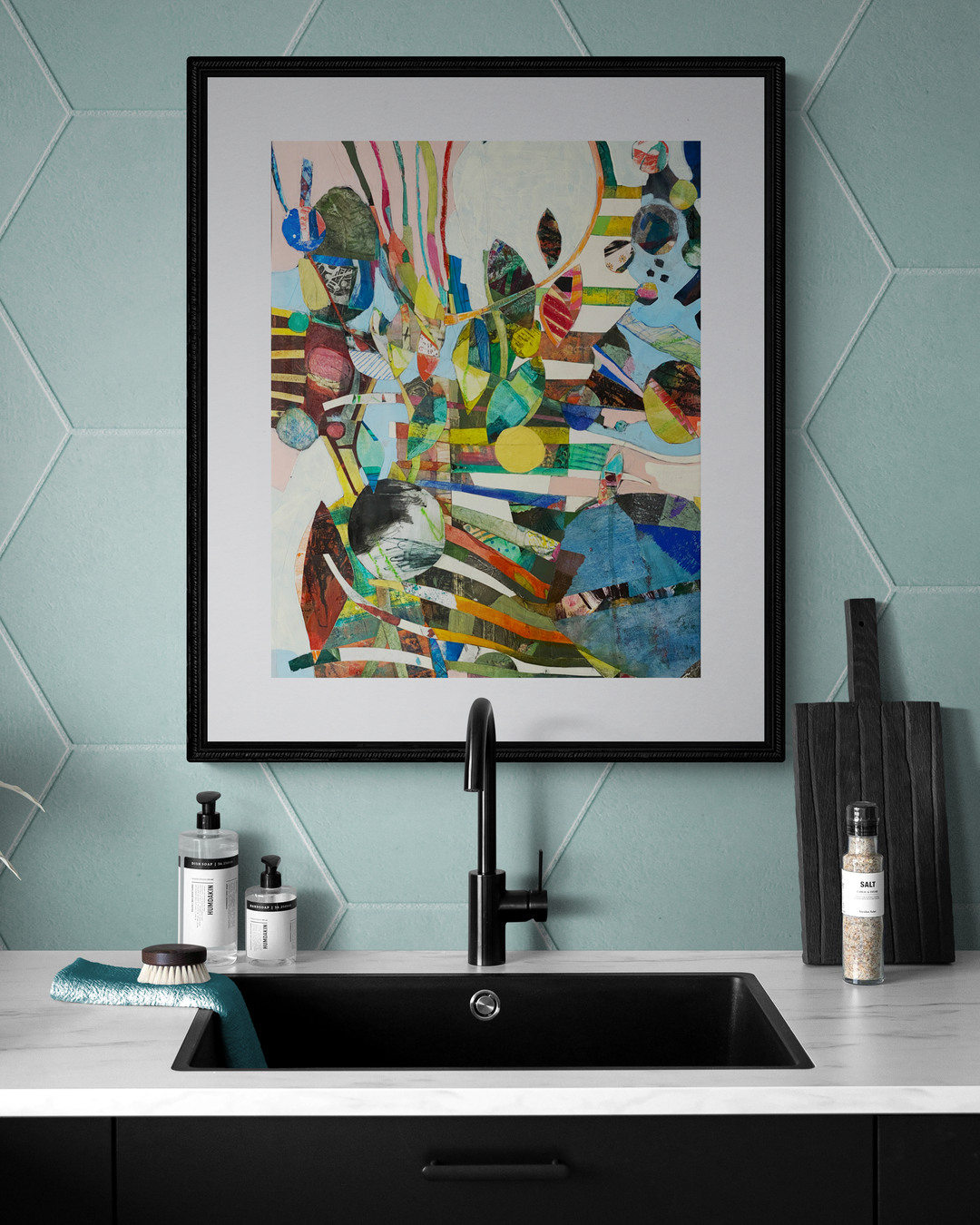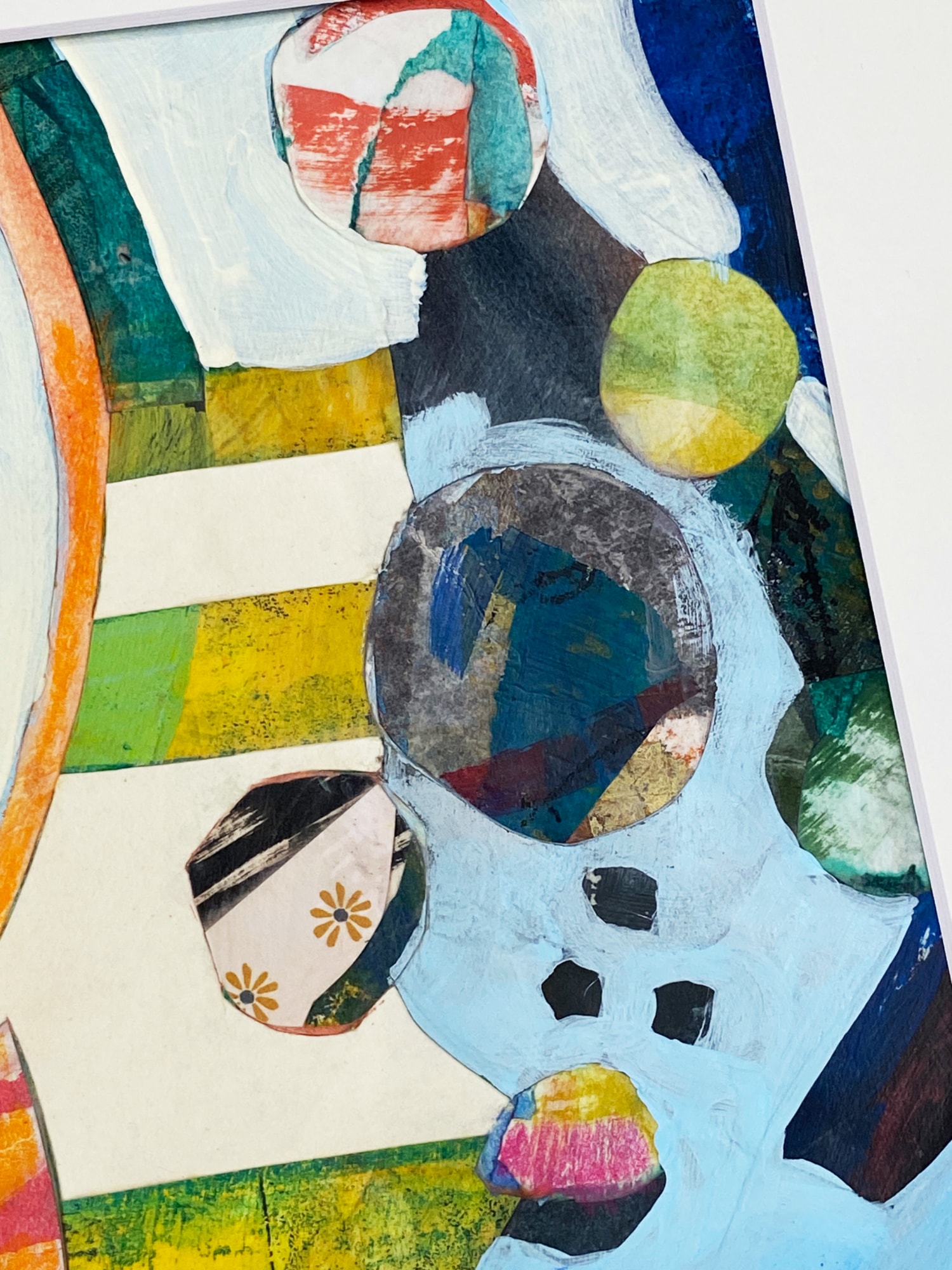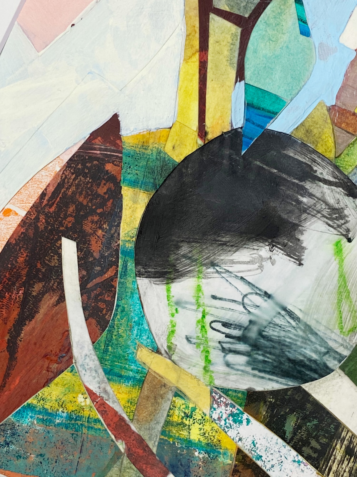 I once heard Ikebana explained not as flower arranging, but as the process of arranging space. My creative process involves a back and forth between building – using collage and paint and drawing -- and cutting away using a knife. My goal is to push and pull at the work until I’ve created an image that both prompts the viewer to take a second look, and reveals more upon closer inspection. When I was working on this piece, I very much felt that I was arranging the space around the stripes that march up and across this piece and therefore couldn’t help but think of Ikebana.