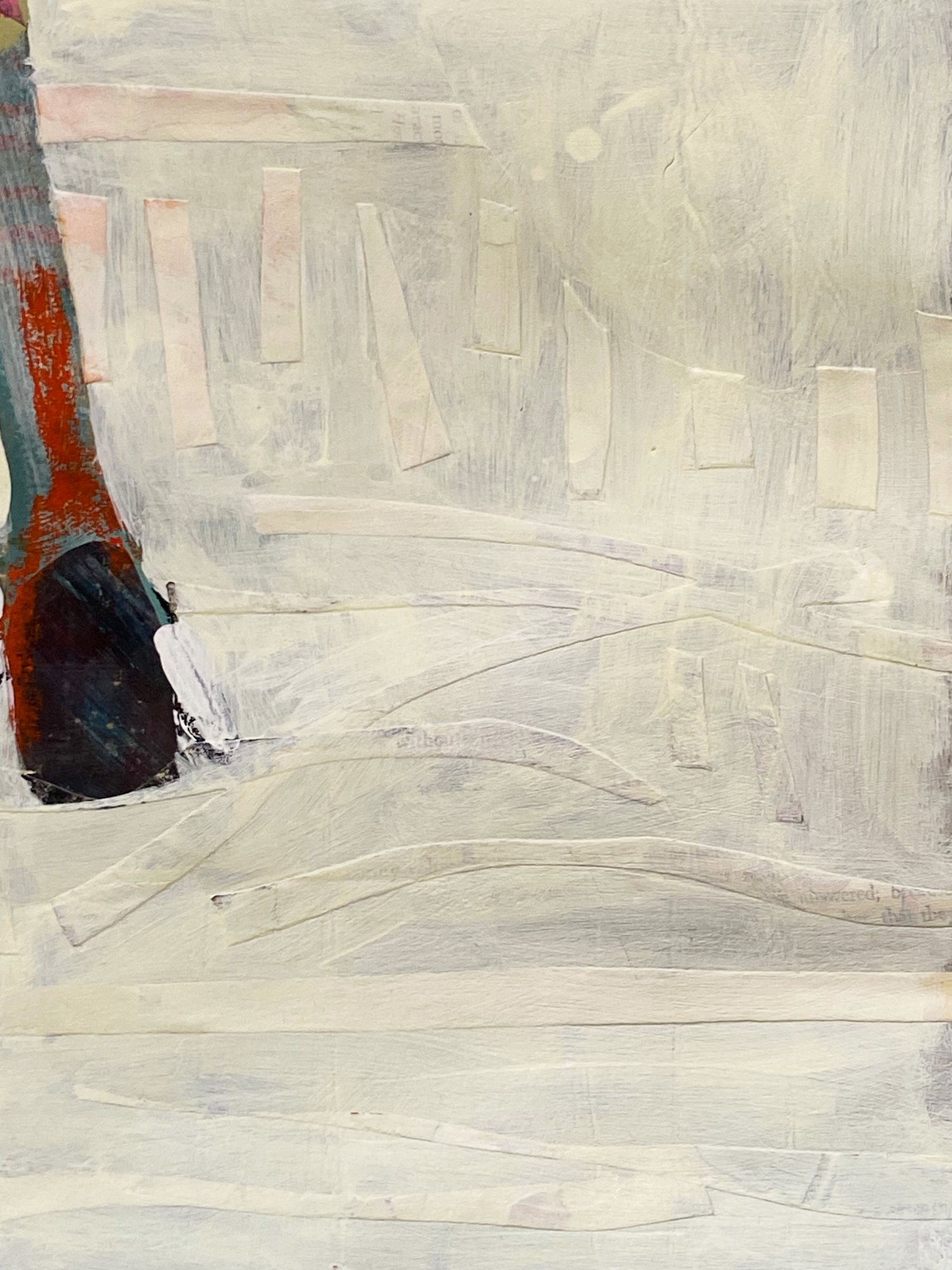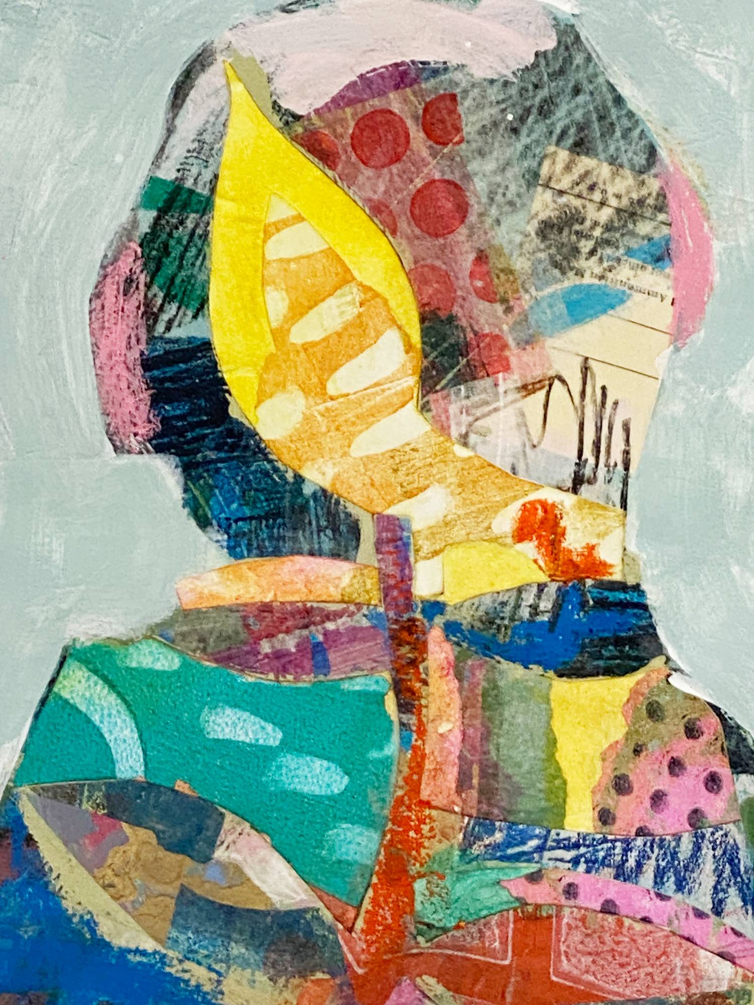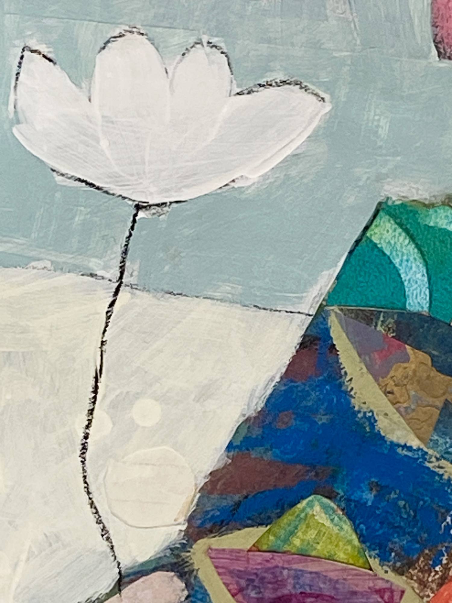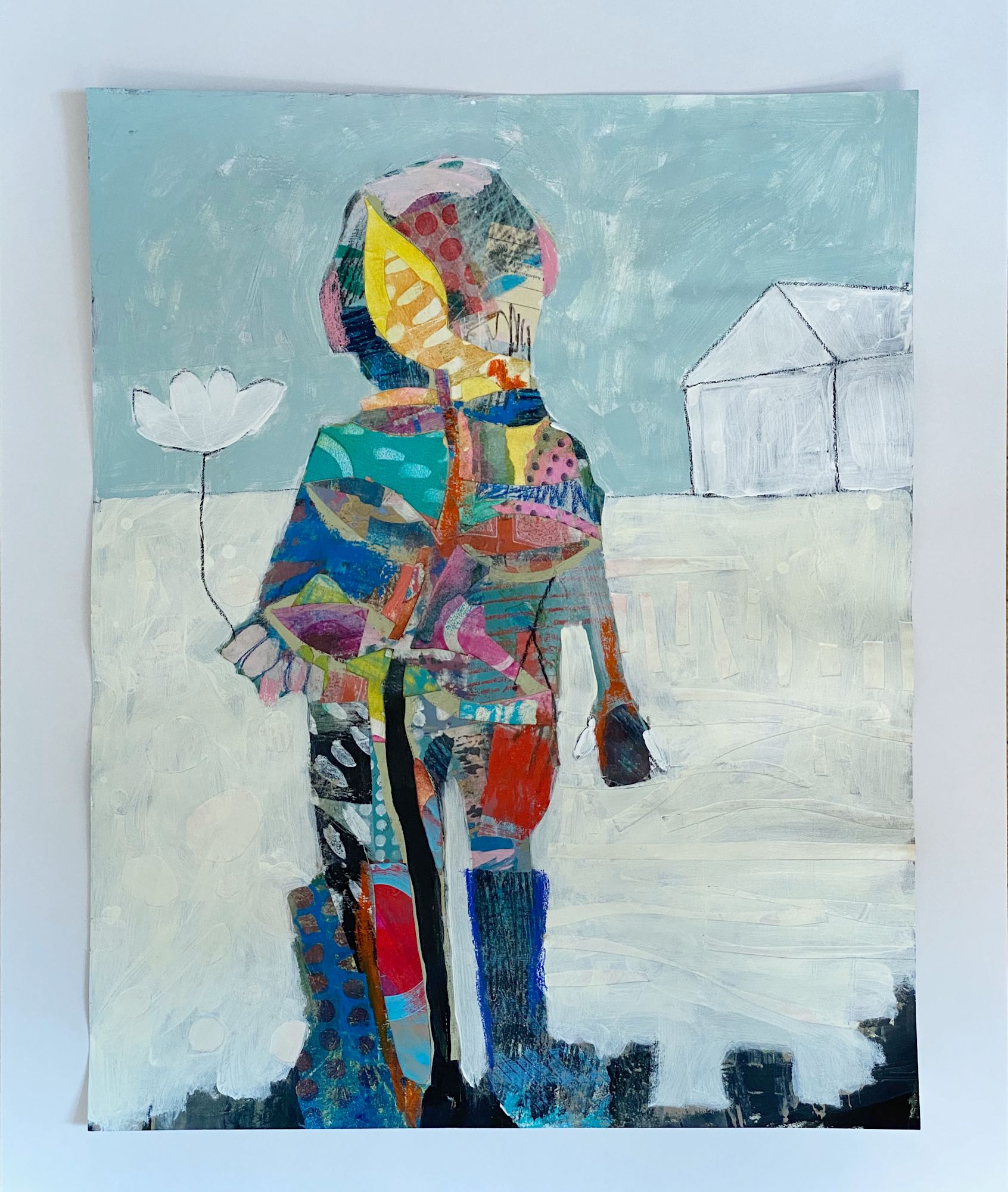 The figure, the flower, the house — they’re all present, but not in any realistic kind of way. They emerge from the collage the way memories do: half-buried, half-true, softened by love and time.