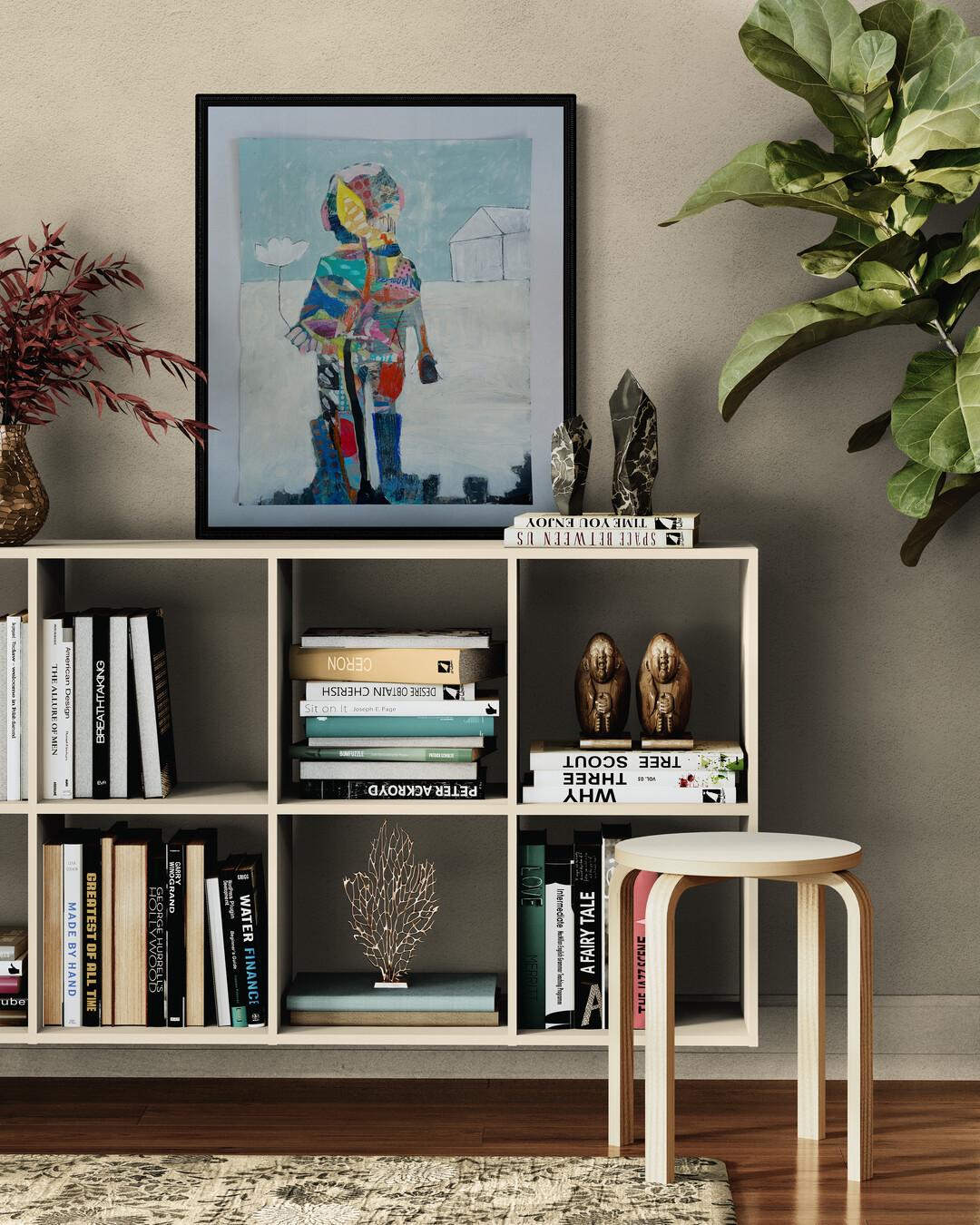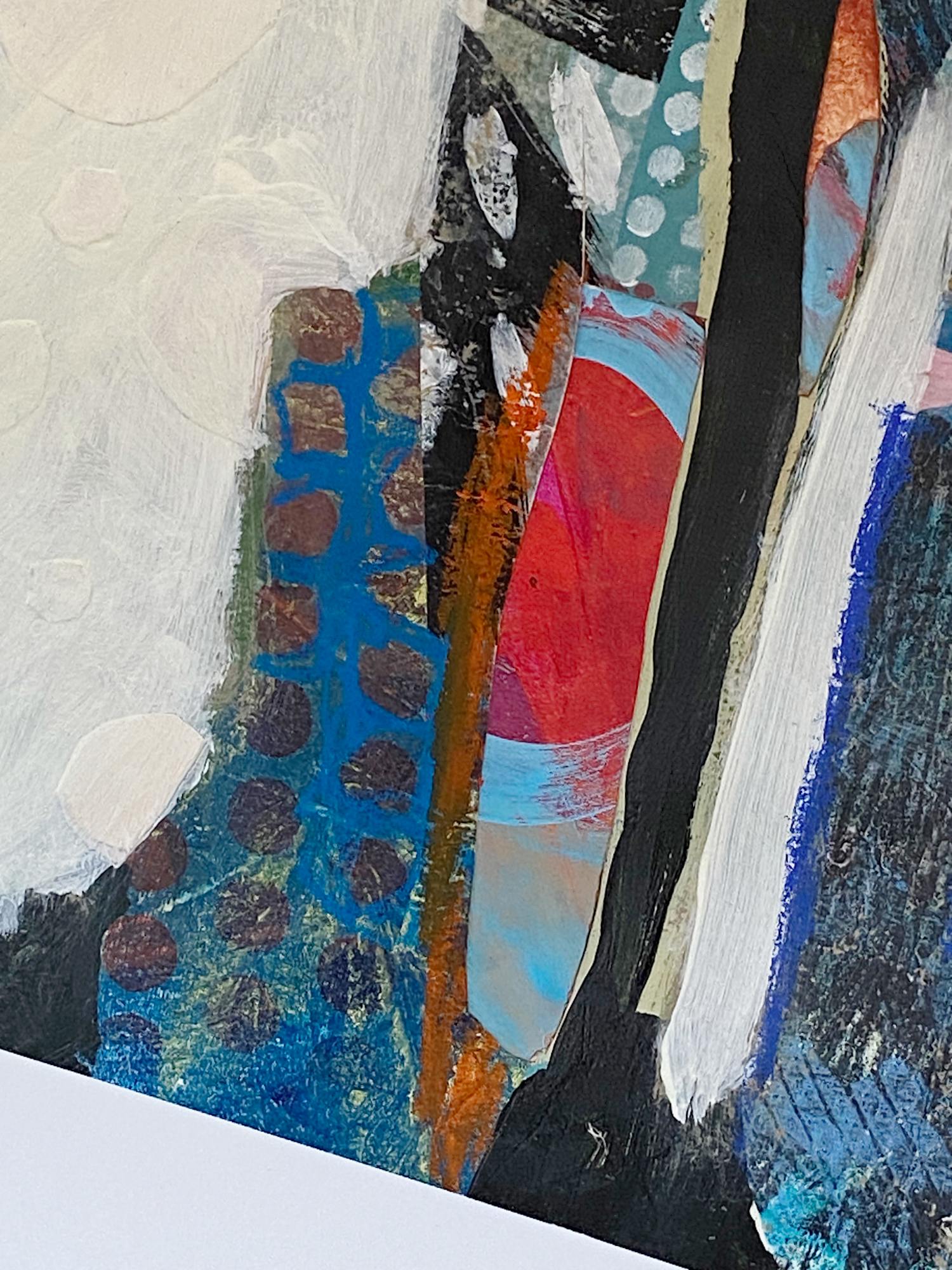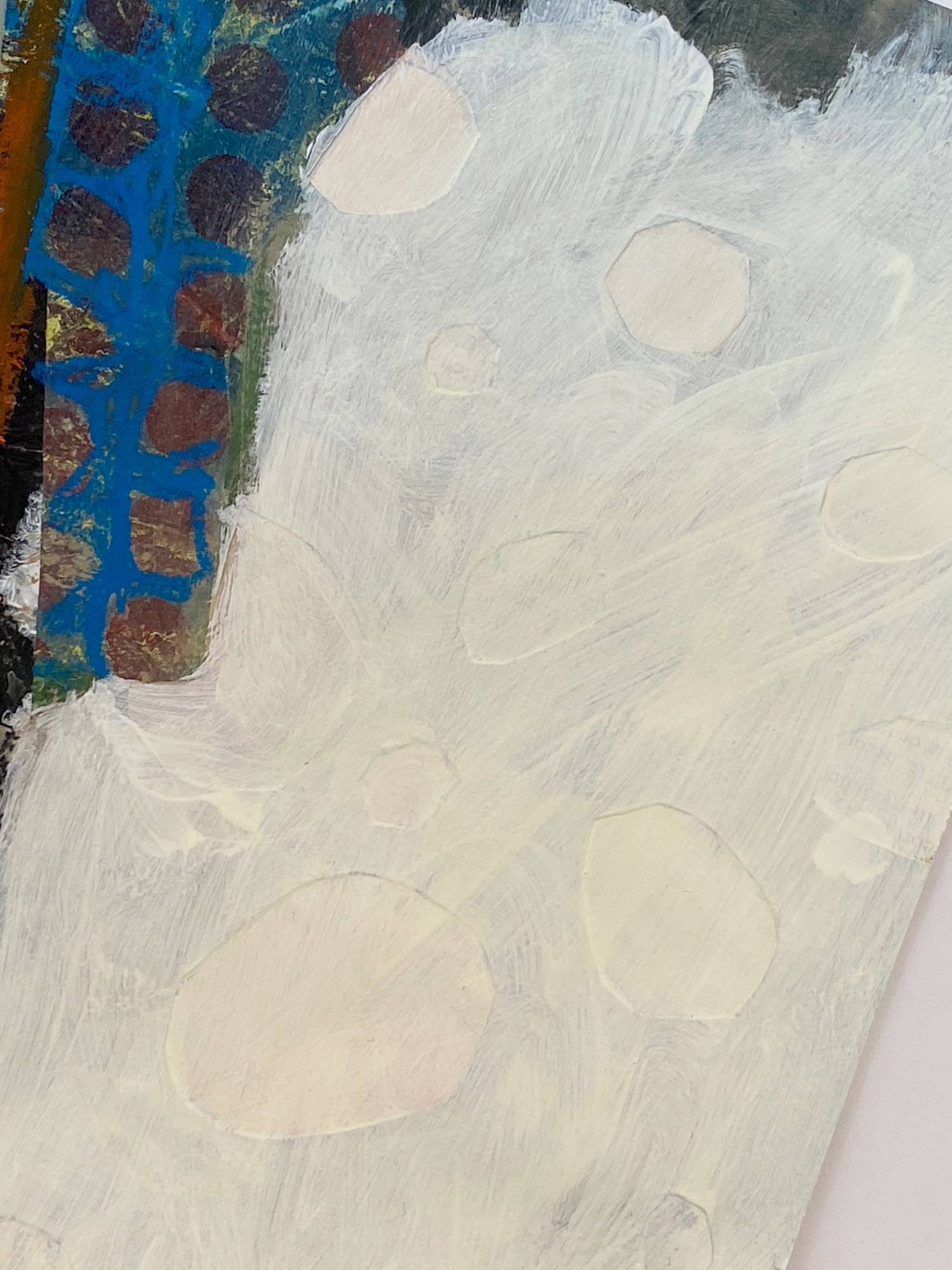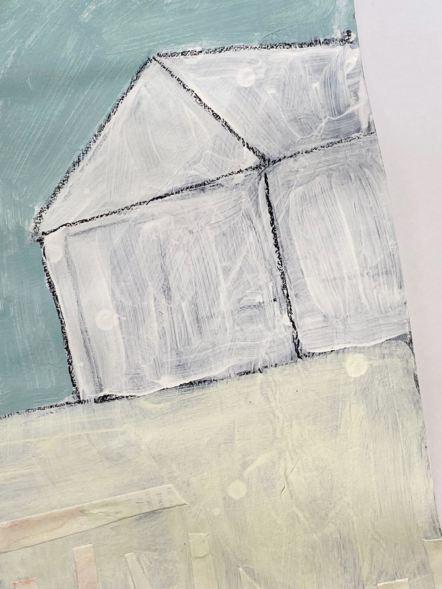 The figure, the flower, the house — they’re all present, but not in any realistic kind of way. They emerge from the collage the way memories do: half-buried, half-true, softened by love and time.