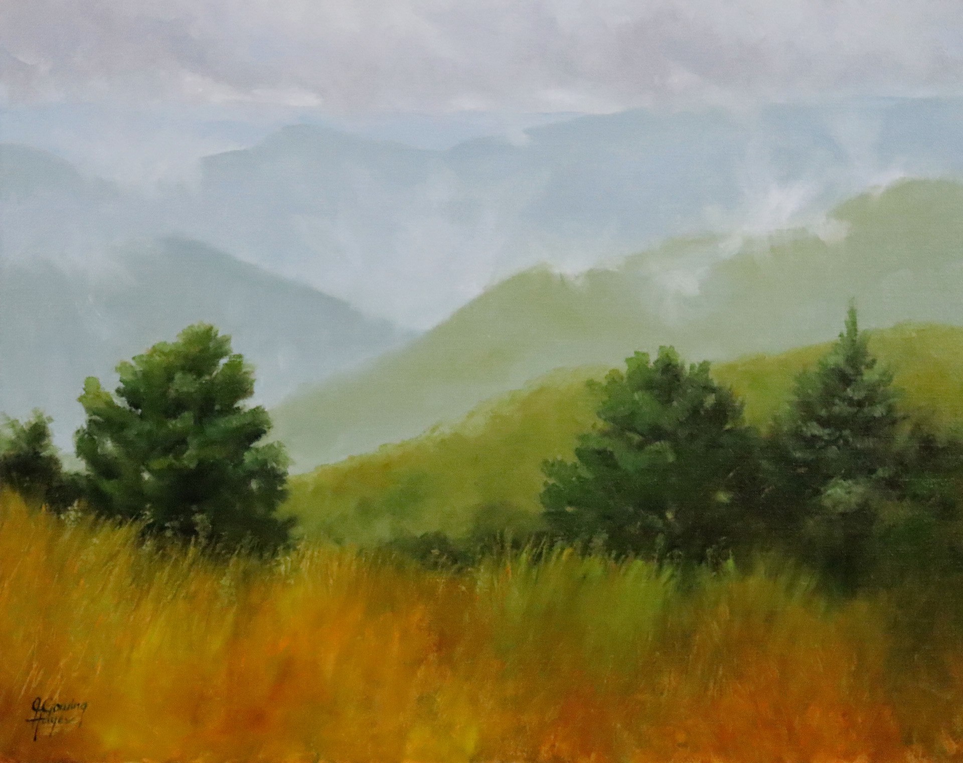 This piece was inspired by a plein air painting done while visiting the Blue Ridge Mountains. When I started painting, the only thing visible was the foreground with the golden grasses and the evergreen trees. Eventually the clouds and fog began to clear revealing the beautiful layers of the mountains beyond.