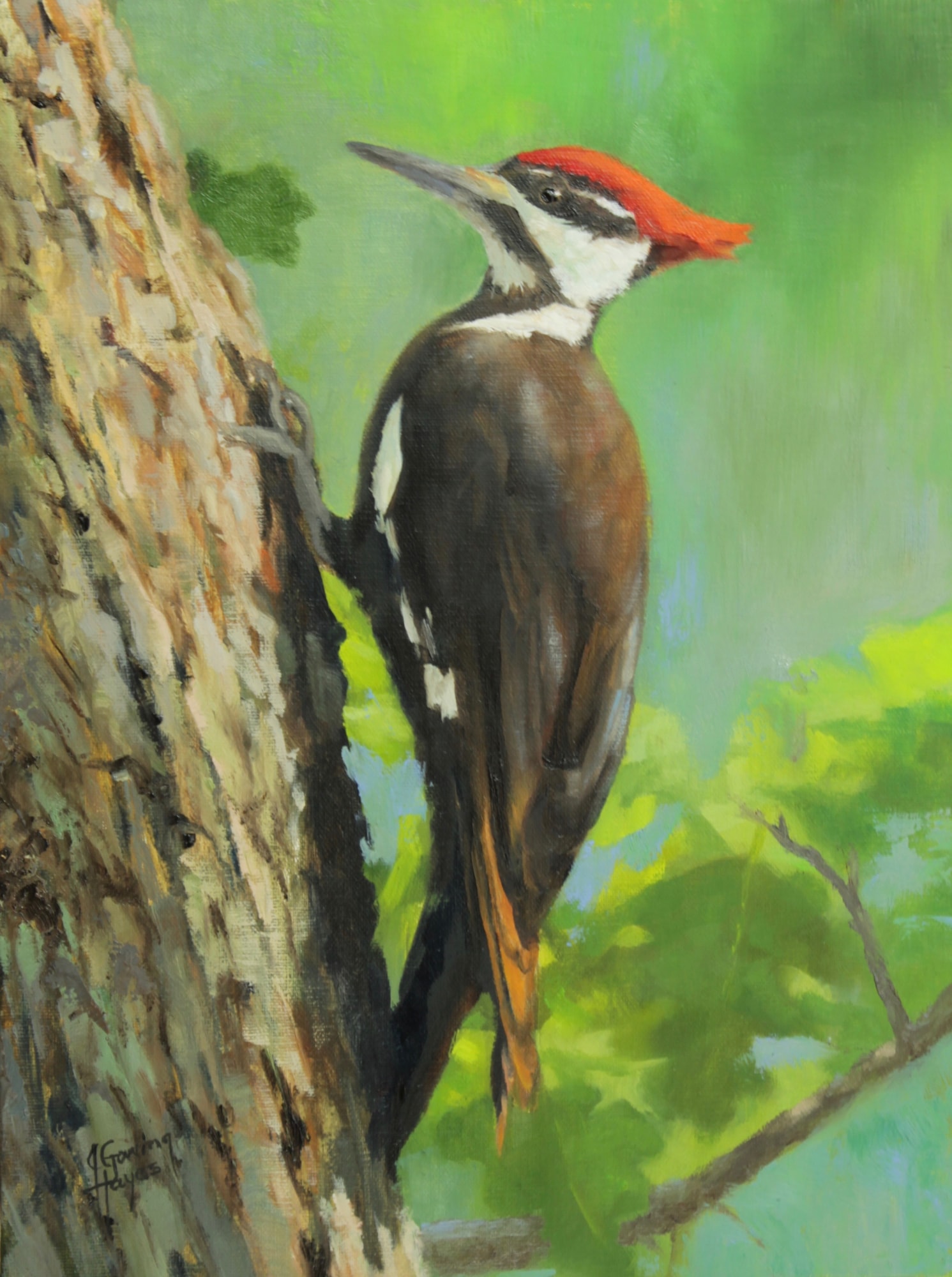 A female Pileated Woodpecker hangs out on a sunlit tree trunk.
