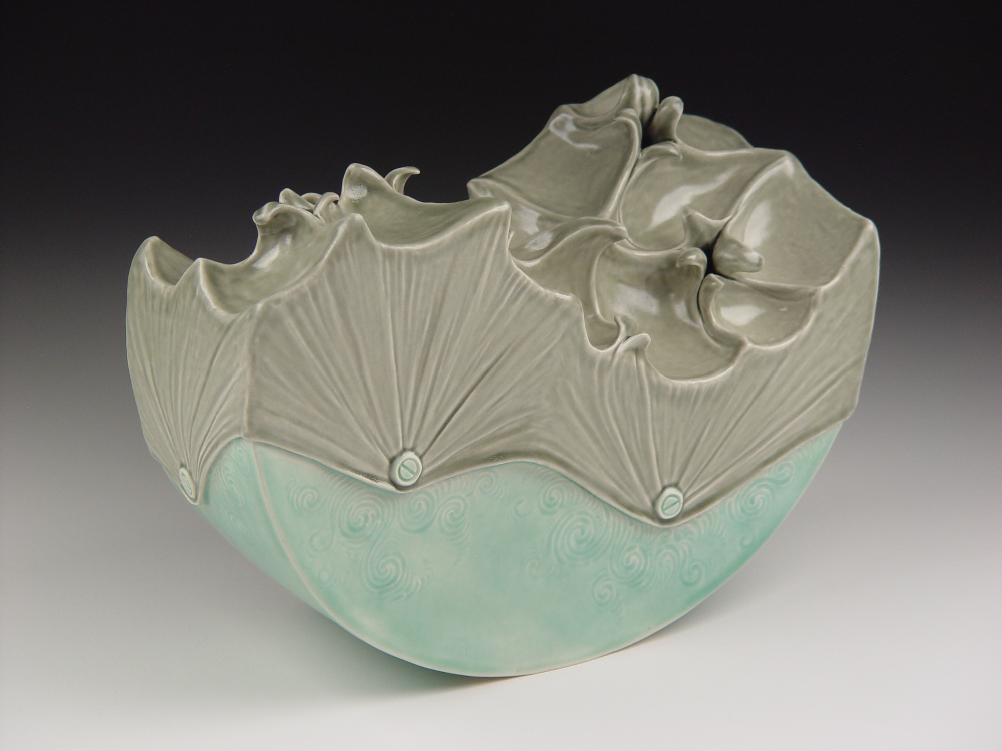 Hand-built, carved, press-molded porcelain sculpture with cone6/7 oxidation glazes