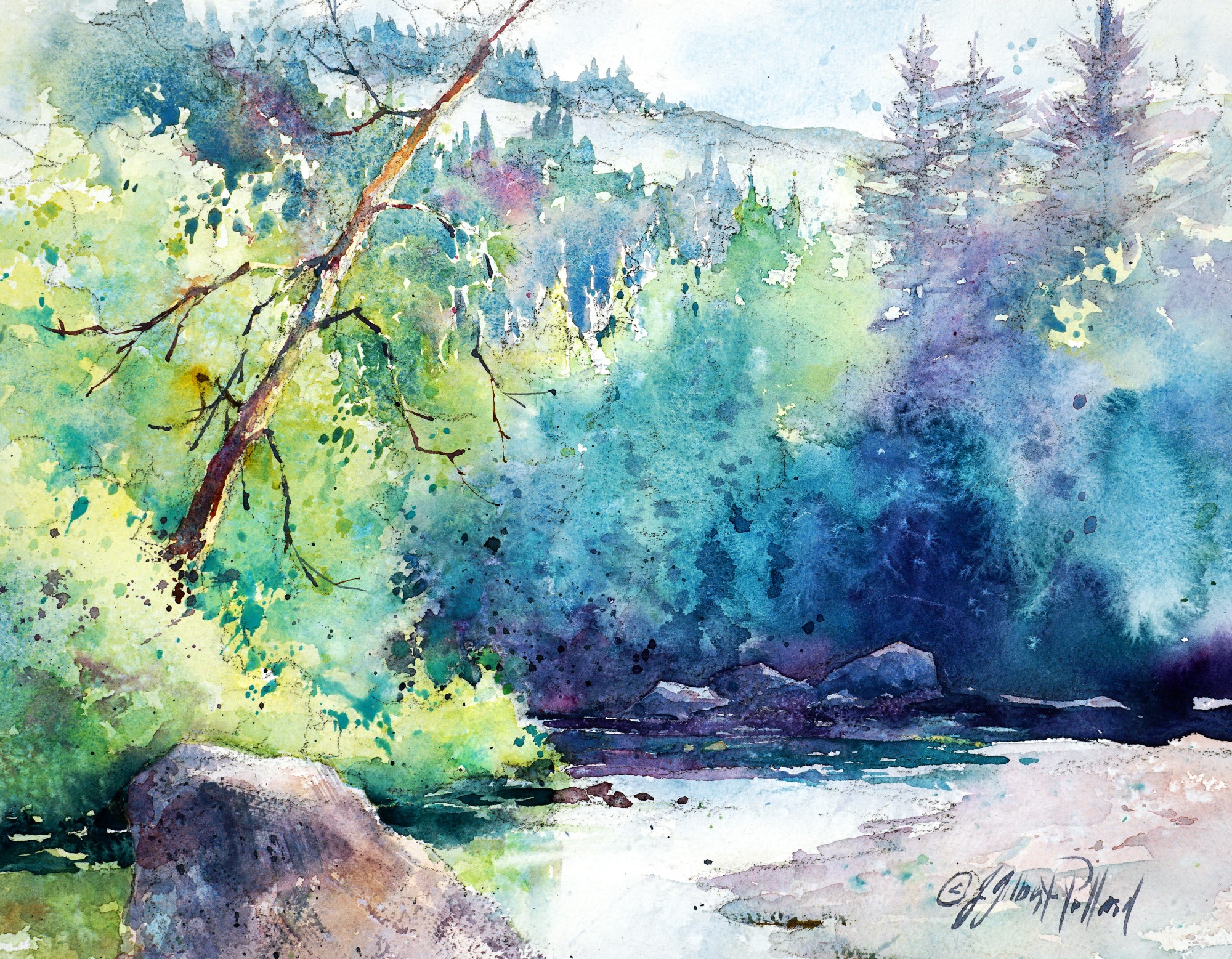 Deep Canyon River is the result of a memory from a drive in the northern California hills several years previously. I had taken a quick photo through a bug-splattered window as we drove - plus, the focus was terrible, the light poor - an awful photo from which to paint! Nevertheless, the image stayed with me and I kept going back to it. Finally, combining memory of mood and the photo's composition, I was able to paint that long-remembered vision that lingered in my mind's eye.
