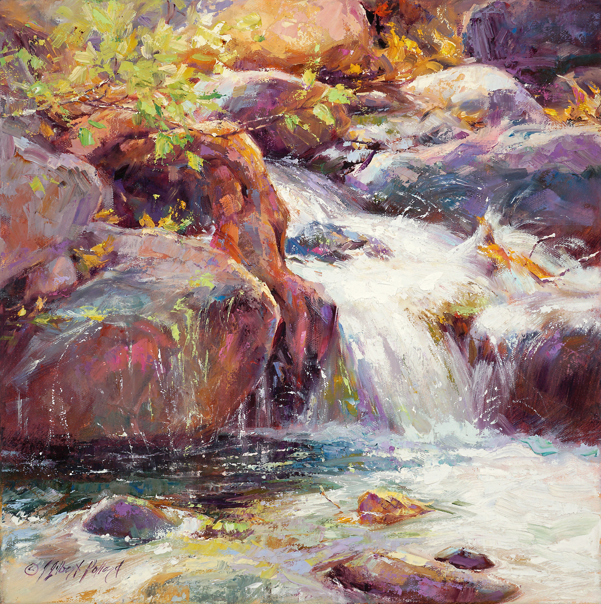 Oak Creek Canyon features a spring-fed creek that winds its path over a rock- and boulder-strewn creek-bed. Every twist, turn and tumble offer magic to the artist’s eye. On this particular afternoon, I was caught by the lowering sun catching the golden leaves and sparkling, fizzing water!