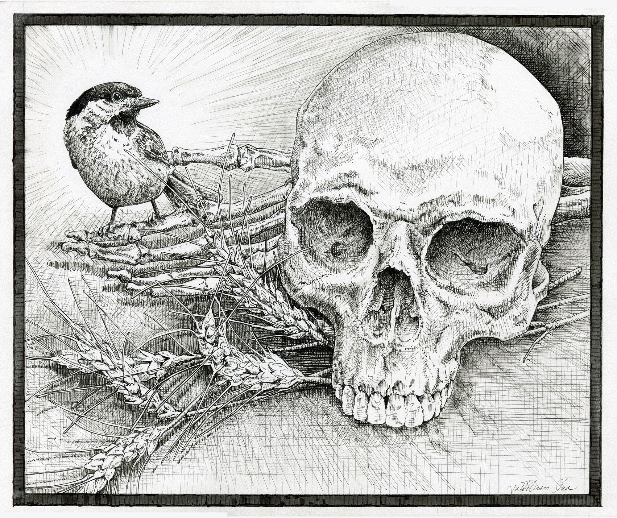 The stalks waving in the wind like an ocean of gold are beautiful to see and inspired this illustration. To find beauty in the cycles of life is the lesson learned by watching the amber waves of wheat roll in the breeze before they are harvested. Stop, close your eyes and hear the rustle of the wheat and joyful songs of the birds. Feel the warmth of the sun on your face and smell the dust and chaff in the air.