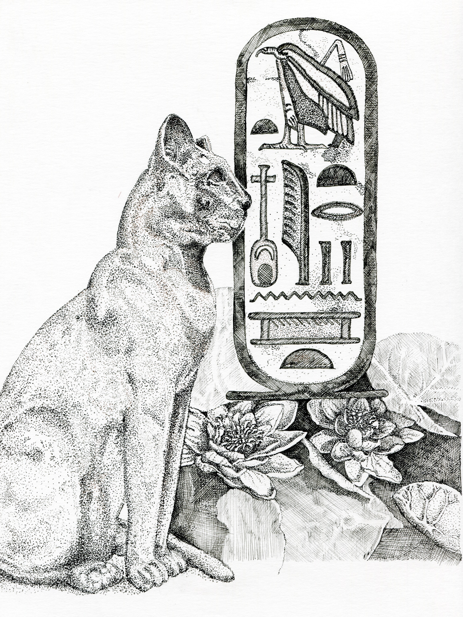 Ancient Egyptian culture and artwork fascinate me. In fact, my MFA thesis show was called "From Aten to Ziggurat" and was my homage to that time in history. This particular illustration was created after seeing the Queen Nefertari exhibit. The source of the cat is a small bronze statue from the exhibit. It is the piece that I spent the most time just looking at with the knowledge that the person who created this piece died thousands of years ago. The hieroglyphics are Queen Nefertari's cartouch. The lilies are to symbolize the Nile River.