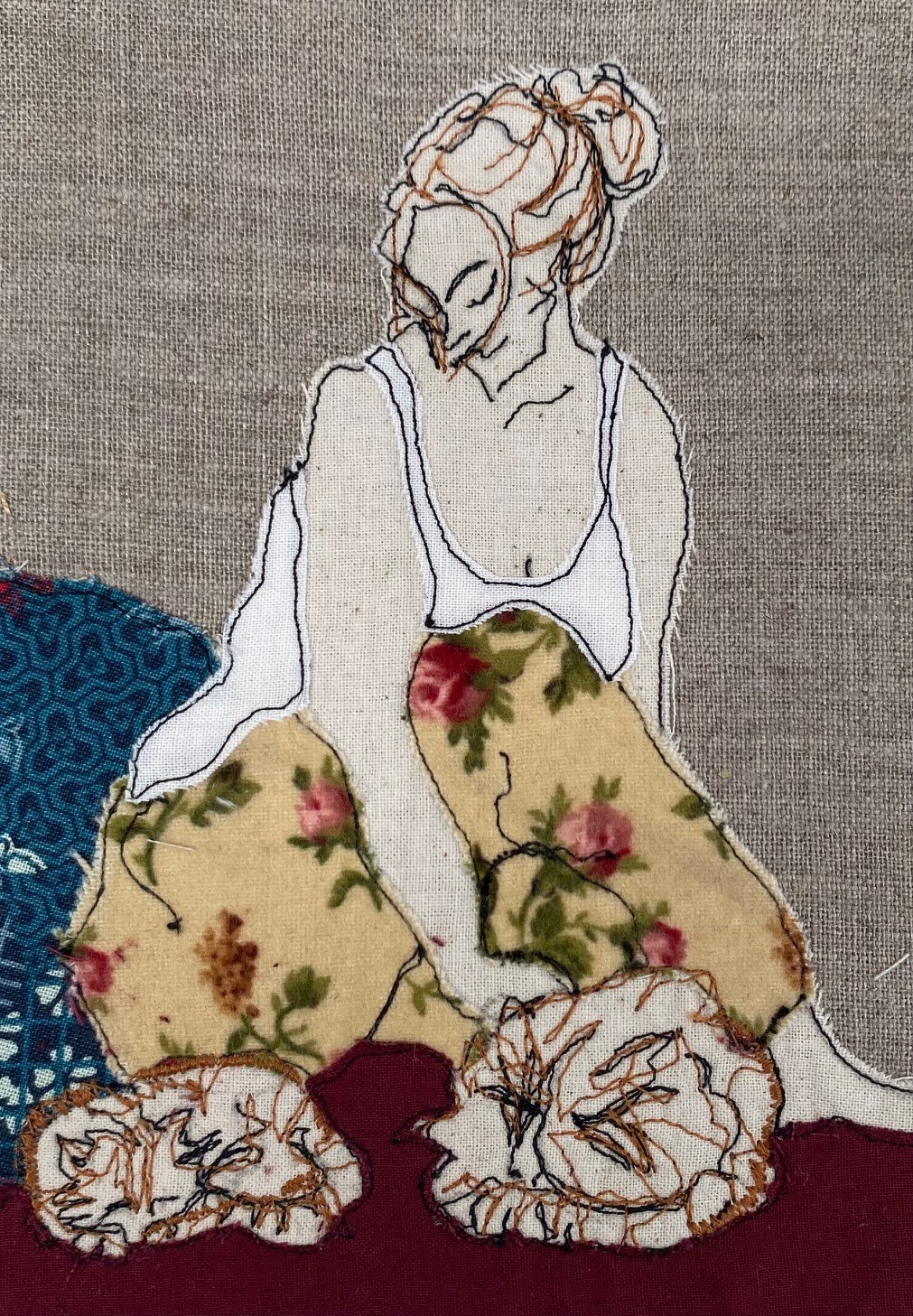 Juliet says, “I choose to work in thread, using the sewing machine as a drawing tool, as I love the extremely expressive quality of the thread drawn line. All of my pieces begin as pencil/ mixed media drawings on paper, working directly from the life model. In designing the thread drawings, I carefully choose colours, patterns, textures from my large collection of preloved fabrics to convey the emotion, character and atmosphere that I wish to communicate in the piece.”