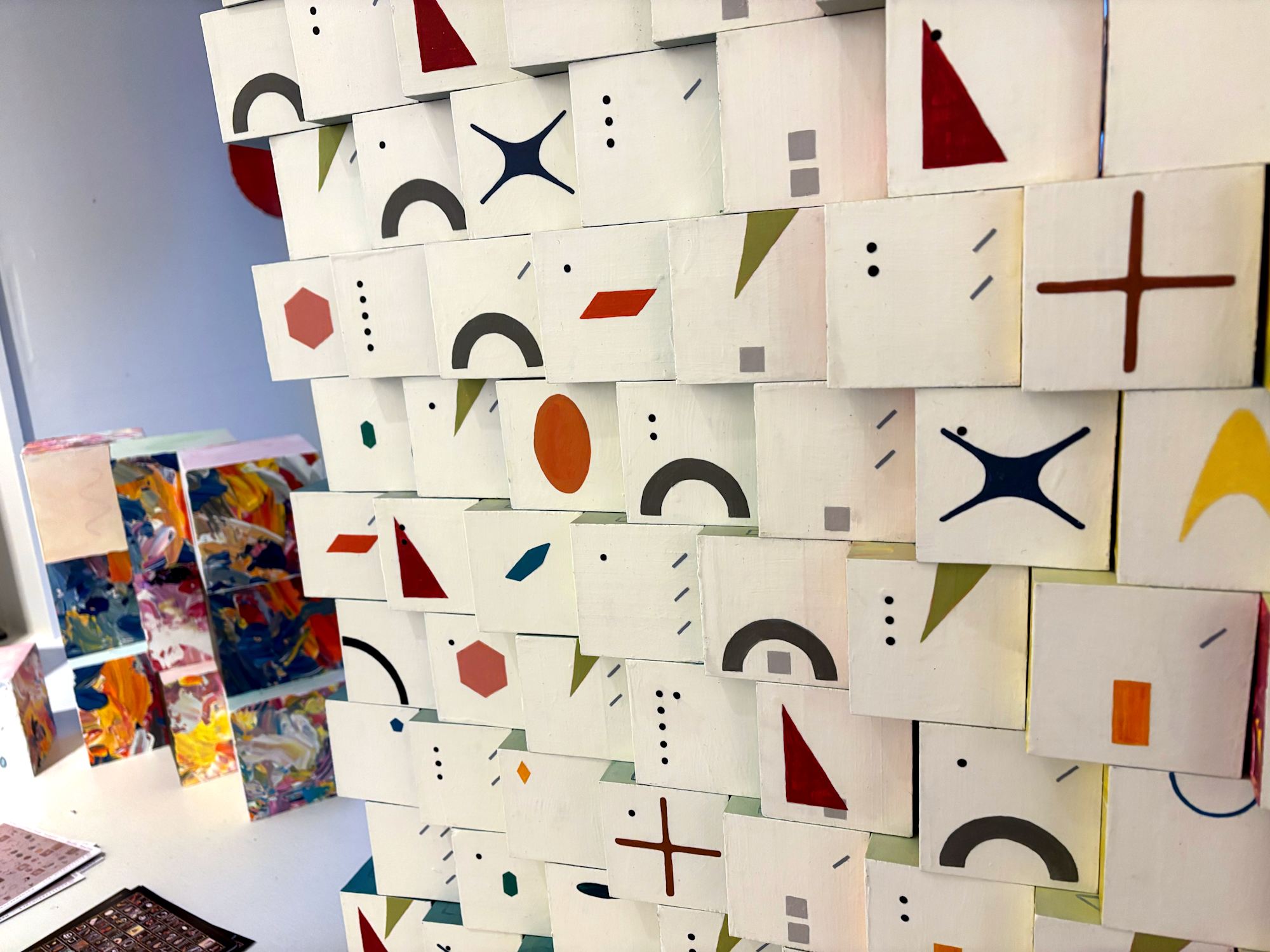 This piece is a mathematical puzzle consisting of 10 wooden blocks. Each block is a 4-inch cube, with each face of each block painted uniquely. The blocks are loose (not glued or connected), allowing them to be freely arranged and played with.