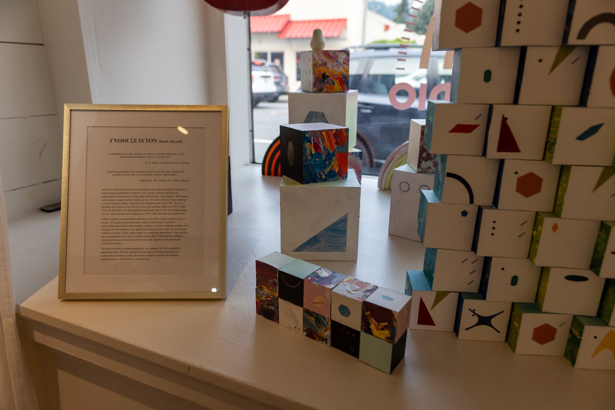 On nine blocks, two of the sides display a mathematical visualization of the prime factorization of the first 9 integers, where each wooden block represents a number between 1 and 9. Each symbol represents a prime number or prime factor. The goal of the puzzle is to place the blocks in the correct order by determining which symbol represents each prime number. The 10th block is a map (key) showing the correct ordering of the blocks.