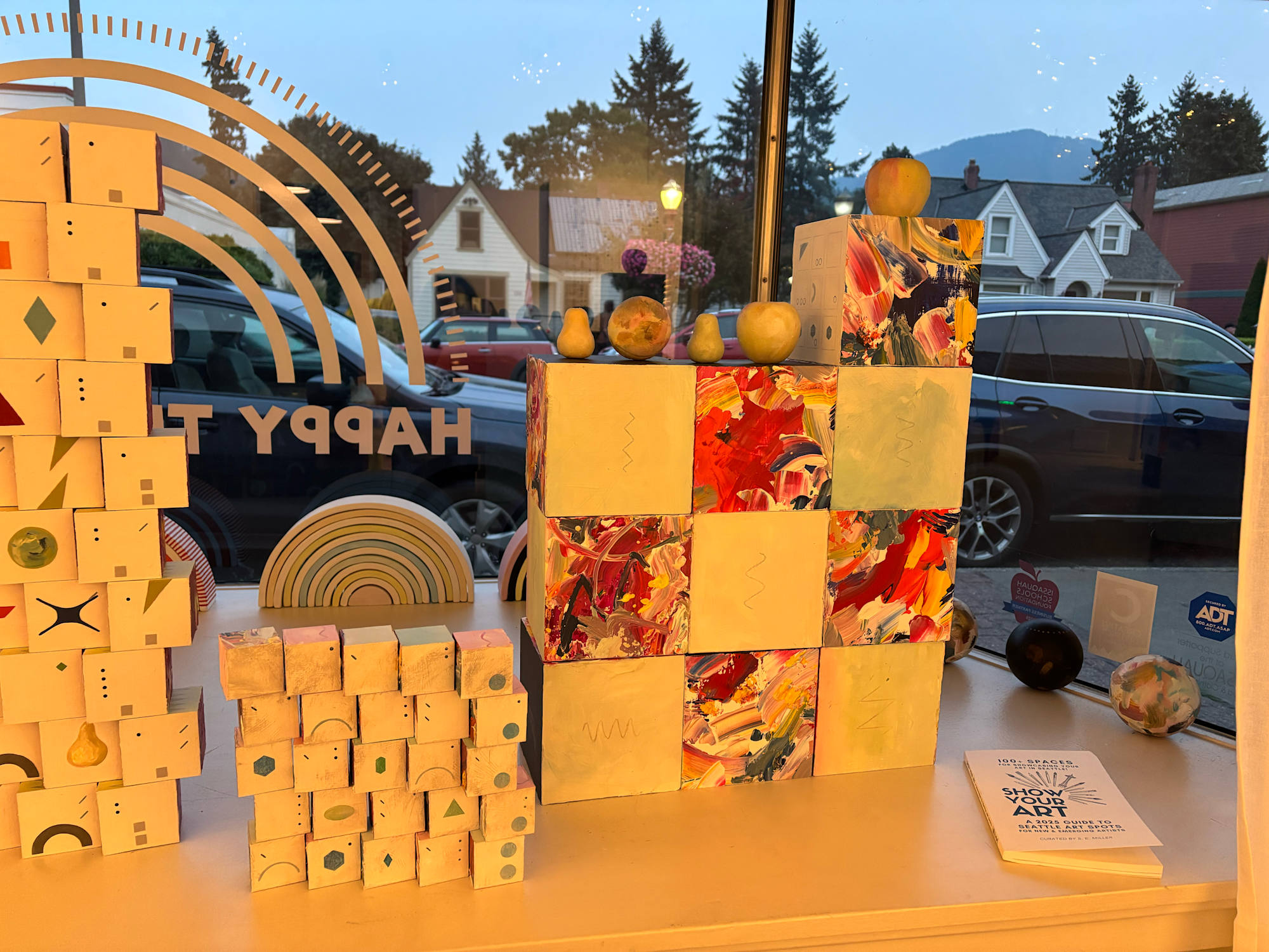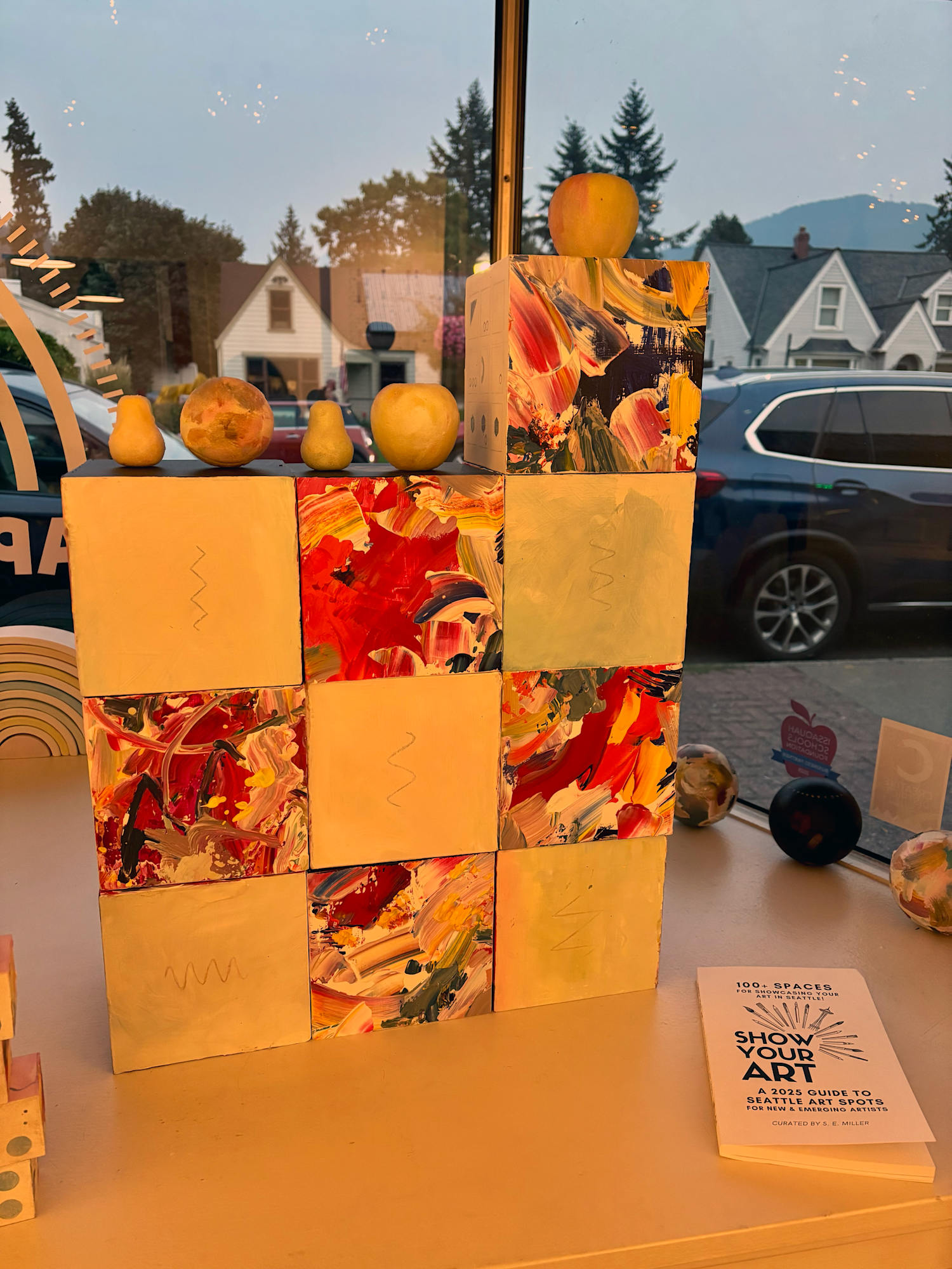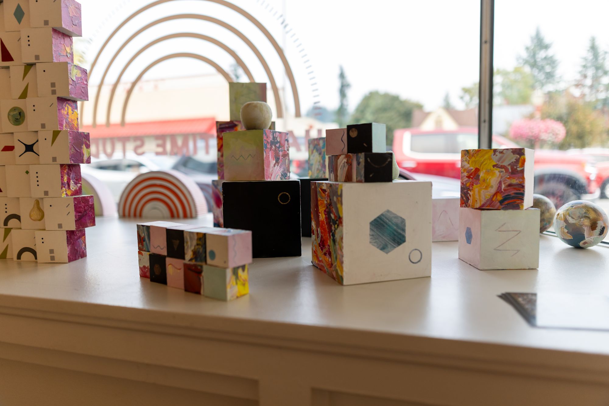This piece is a mathematical puzzle consisting of 10 wooden blocks. Each block is a 6-inch cube, with each face of each block painted uniquely. The blocks are loose (not glued or connected), allowing them to be freely arranged and played with.
