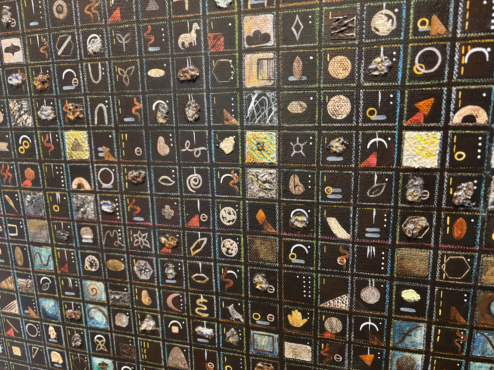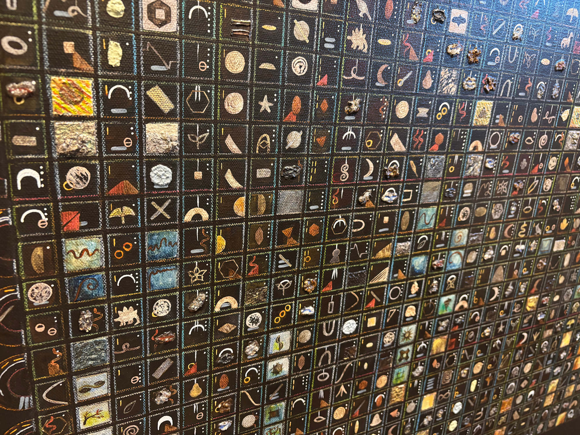 Filled-in squares represent prime numbers, each with a unique symbol or texture. All squares greater than one contain compositions of symbols representing prime factors that multiply together to yield a composite number. For example, a dot represents two. A dash represents three. The sixth square contains a dot and a dash, representing “six equals two times three.” The dark and light paintings contain the same symbols and structure, mirrored in each other. Viewed from a distance, natural patterns and symmetries in the prime and composite numbers become visually apparent.