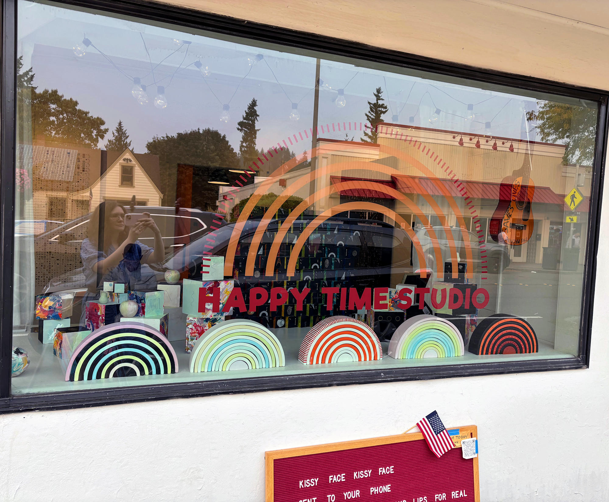 Each stacking rainbow is made of 12 individually painted arches. The pieces can be mixed and matched to create new designs. Pictured: the stacking rainbows displayed in the window at my solo show at Gnothi Seauton (know thyself) at Happy Time Studio in Issaquah, WA. The center stacking rainbow has been painted to resemble the logo for Happy Time Studio.