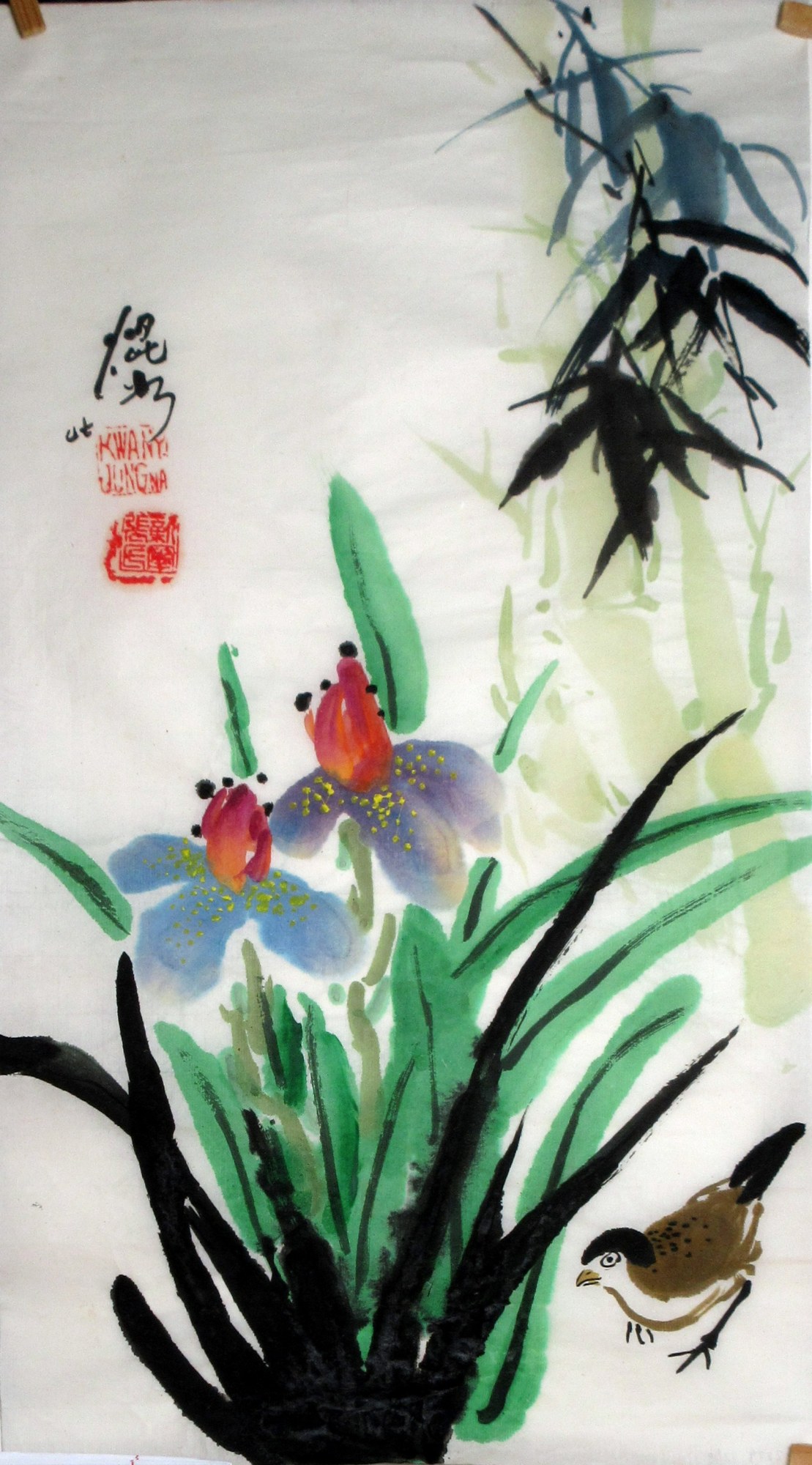 Colorful orange-brown, blue-violet irises with a bird. Unmounted.