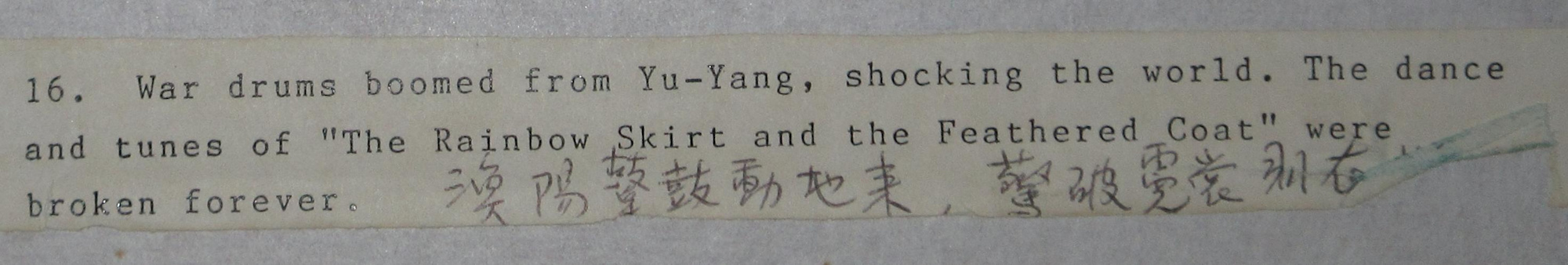16. War drums boomed from Yu-Yang, shocking the world. The dance and tunes of the "The Rainbow Skirt and the Feathered Coat" were broken forever.
