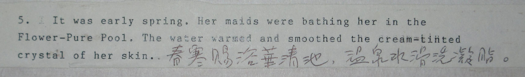 5. It was early spring. Her maids were bathing her in the Flower-Pure Pool. The water warmed and smoothed the cream-tinted crystal of her skin.