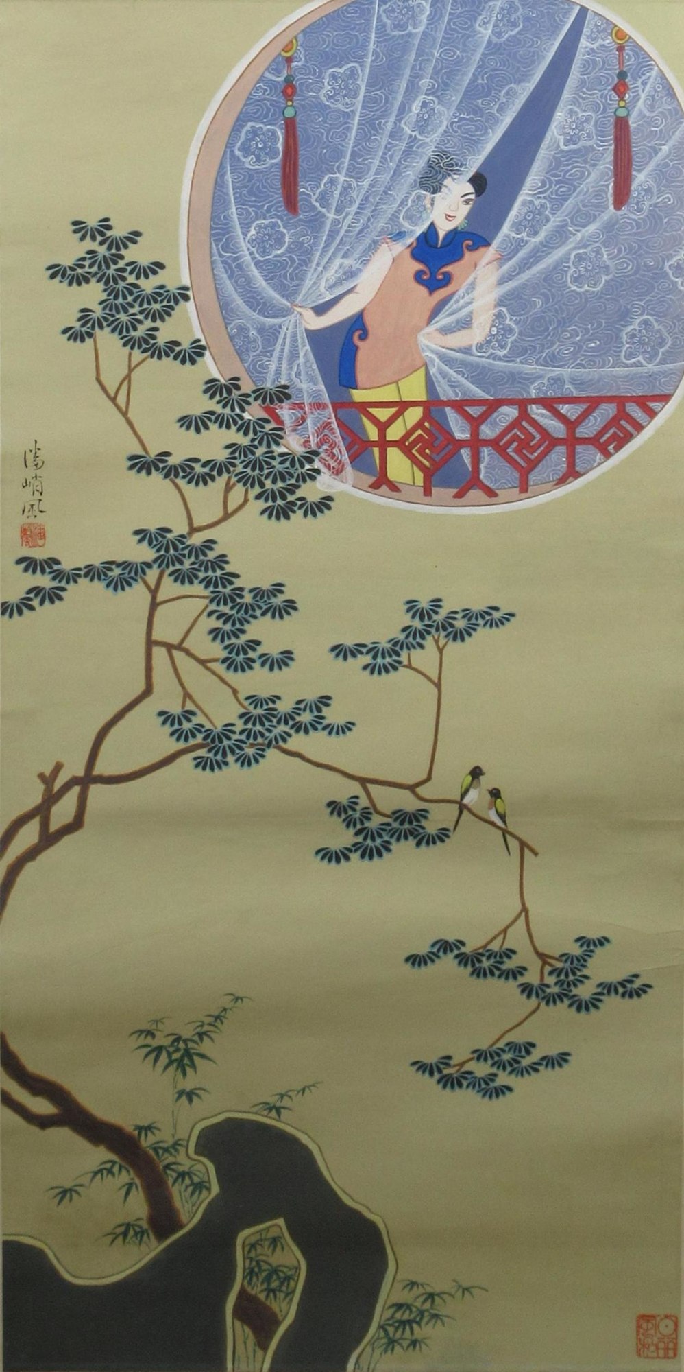 A woman peers out through lace curtains overlooking a tree with two birds. Mounted on a scroll with a brocade border.