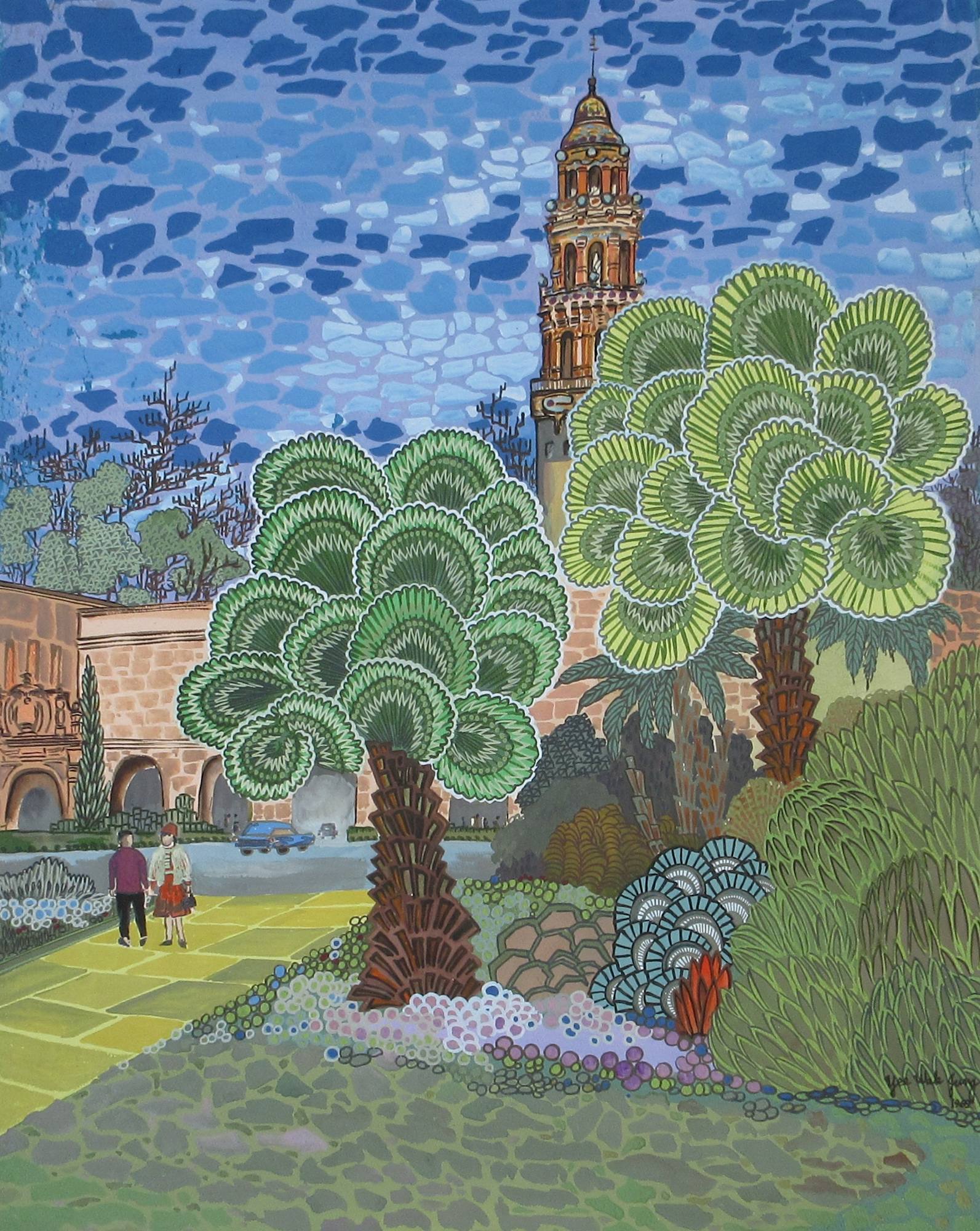 Two people walk past stylized Mexican fan palms and Balboa Park with a mosaic-like painted sky.
