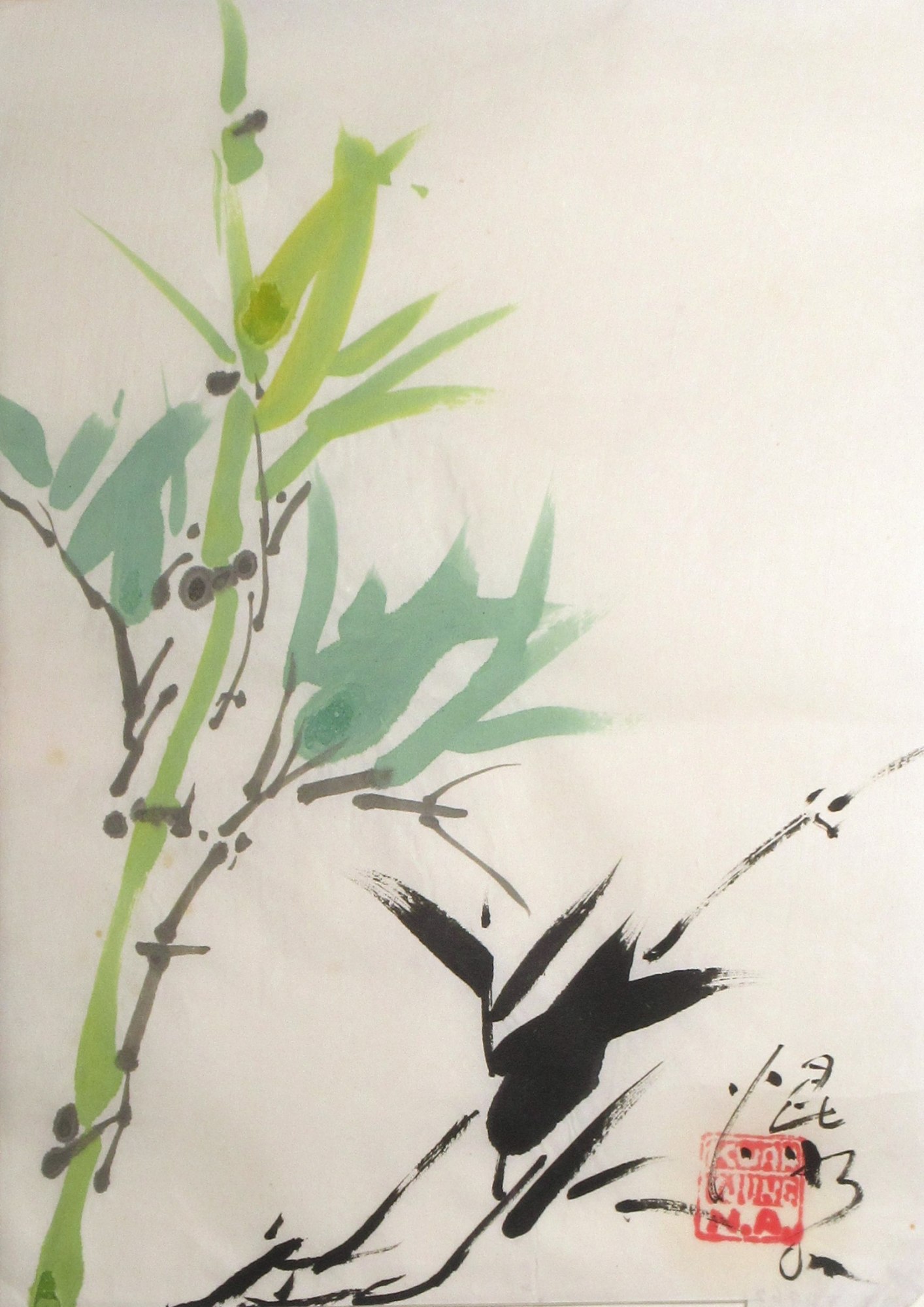 Light blue, yellow-green and black bamboo leaves. Unmounted.