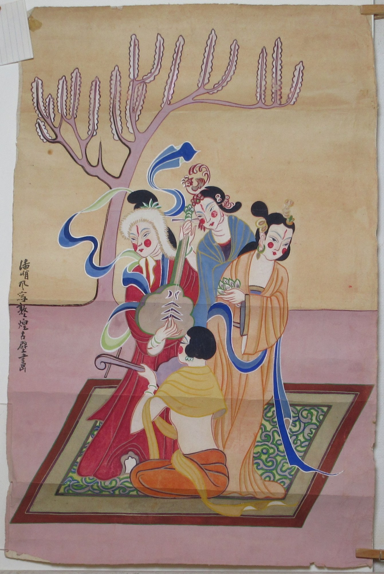 A decorative painting of four women on an ornate rug. Two are playing musical instruments. The women having painted faces.