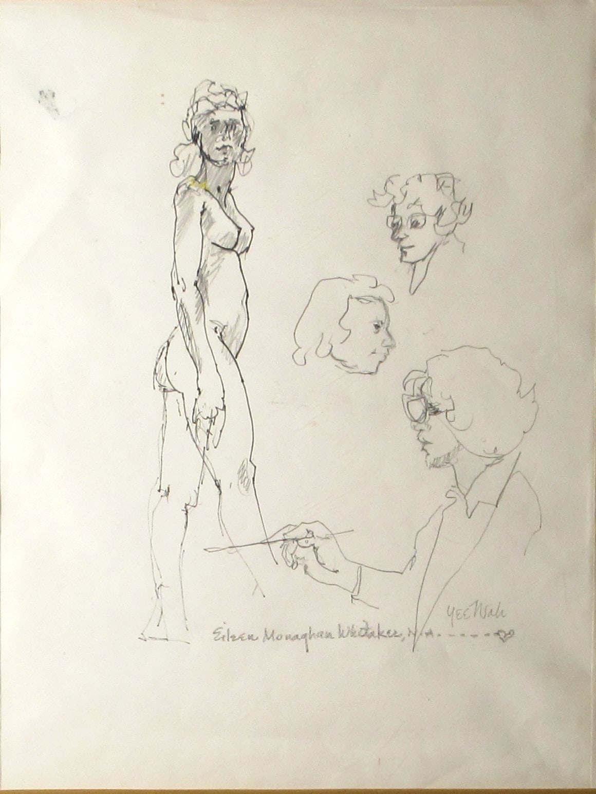 An ink drawing of a nude, two faces and Yee Wah painting. Matted and framed. The other side of the painting also has a nude in pencil.