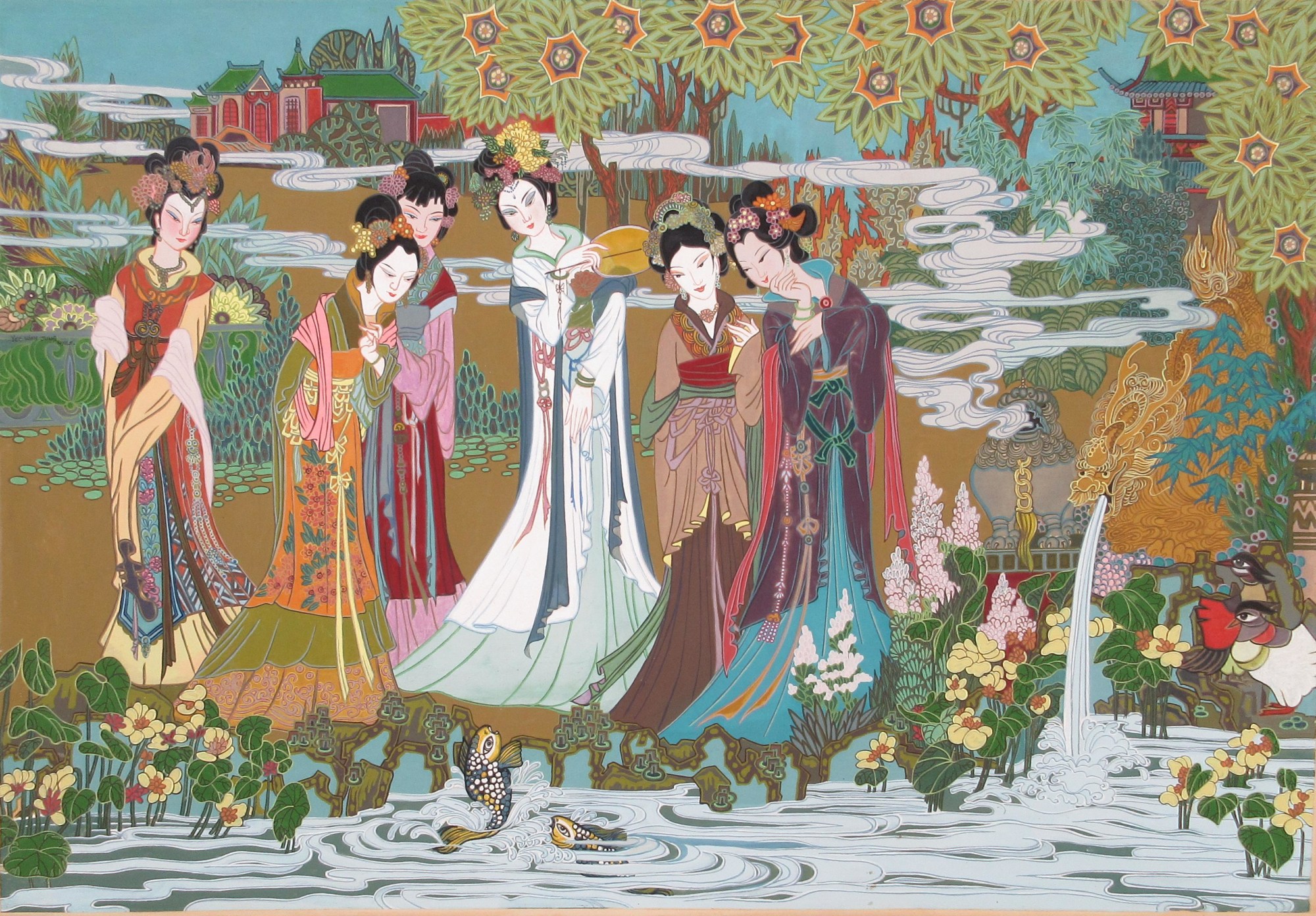 A painting in the tu-aunqua style with six women in flowing attire, observing leaping fish in a pond fed by a golden dragon, incense smoke in the air.