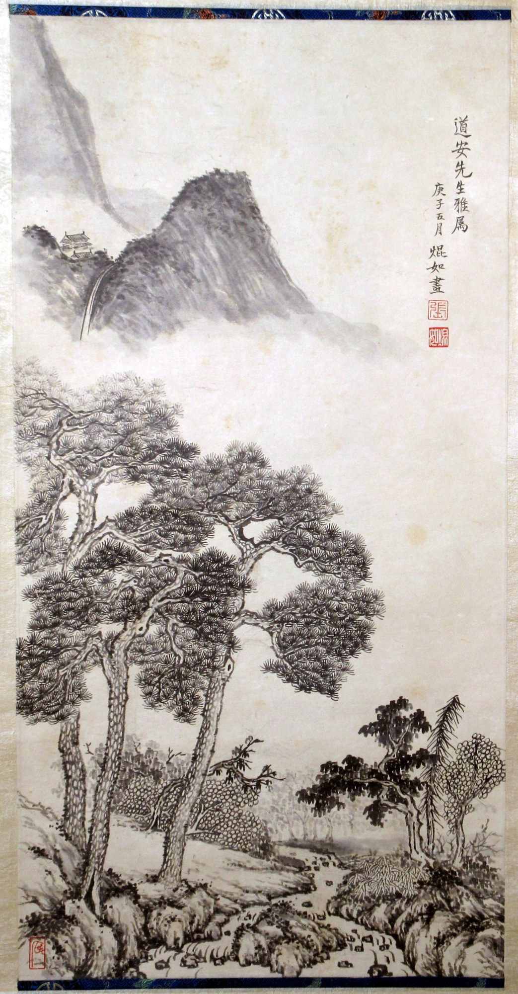 A scroll painting of mountains above fog, trees and stream below. Scroll has brocade fabric border.