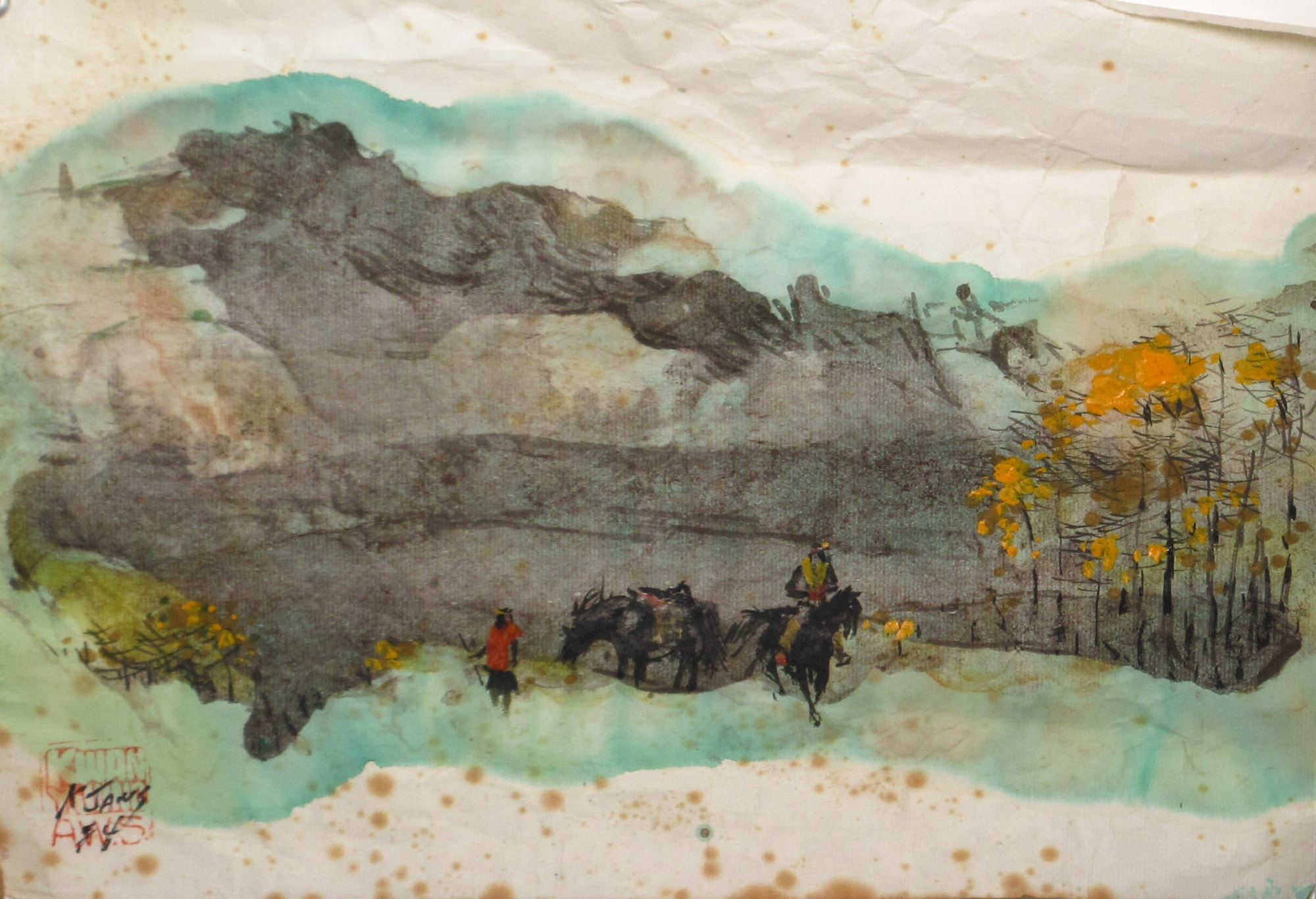 An unmounted painting of a mountain scene with forest trees with yellow leaves. Two figures with horses emerging from the foothills.