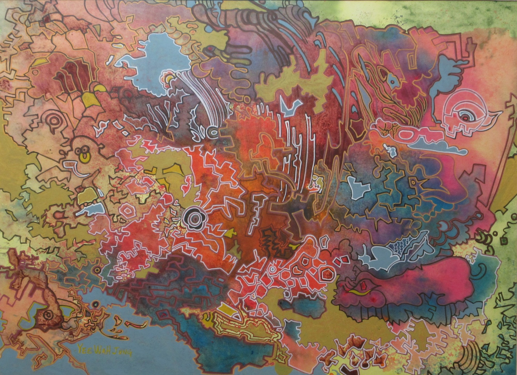 A colorful, mosaic-like painting with some elements similar to a map. Matted in white and in a simple wooden frame under glass.