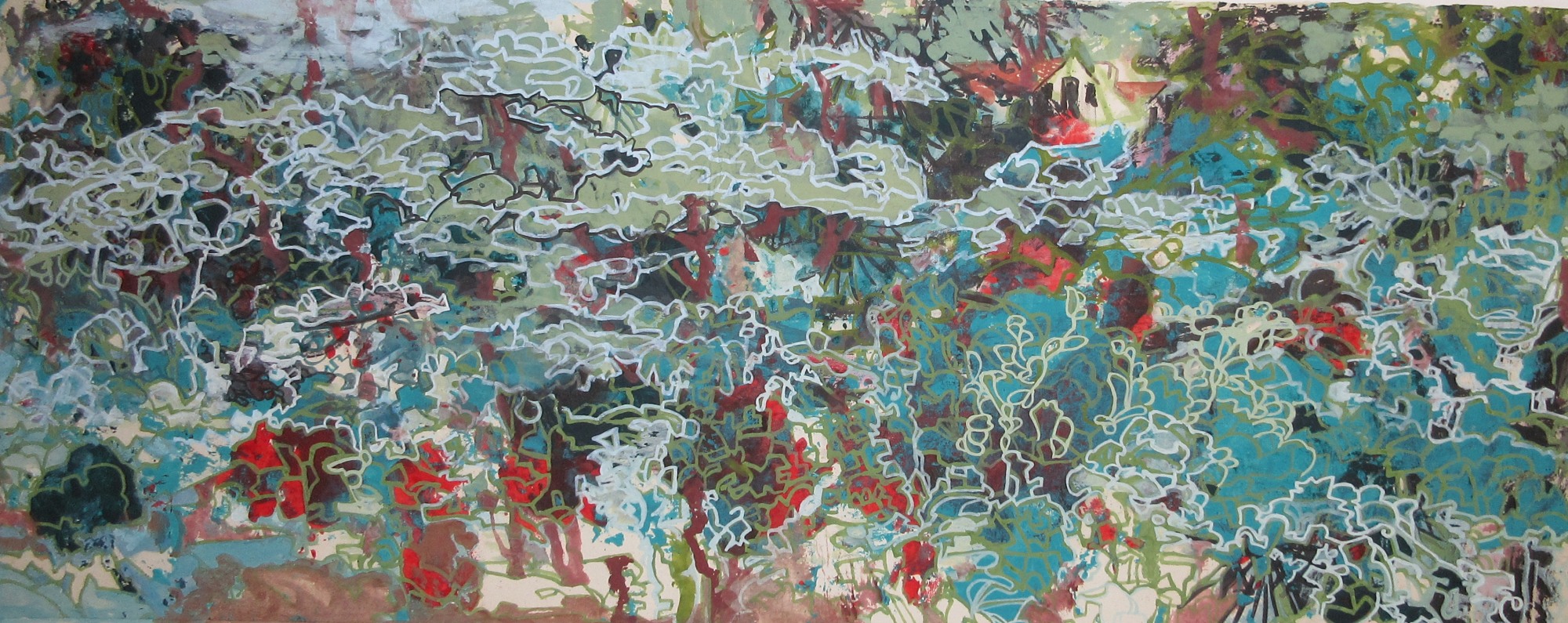 A mosaic-like painting of an abstract garden with a house in the distance. Mounted on painted plywood.