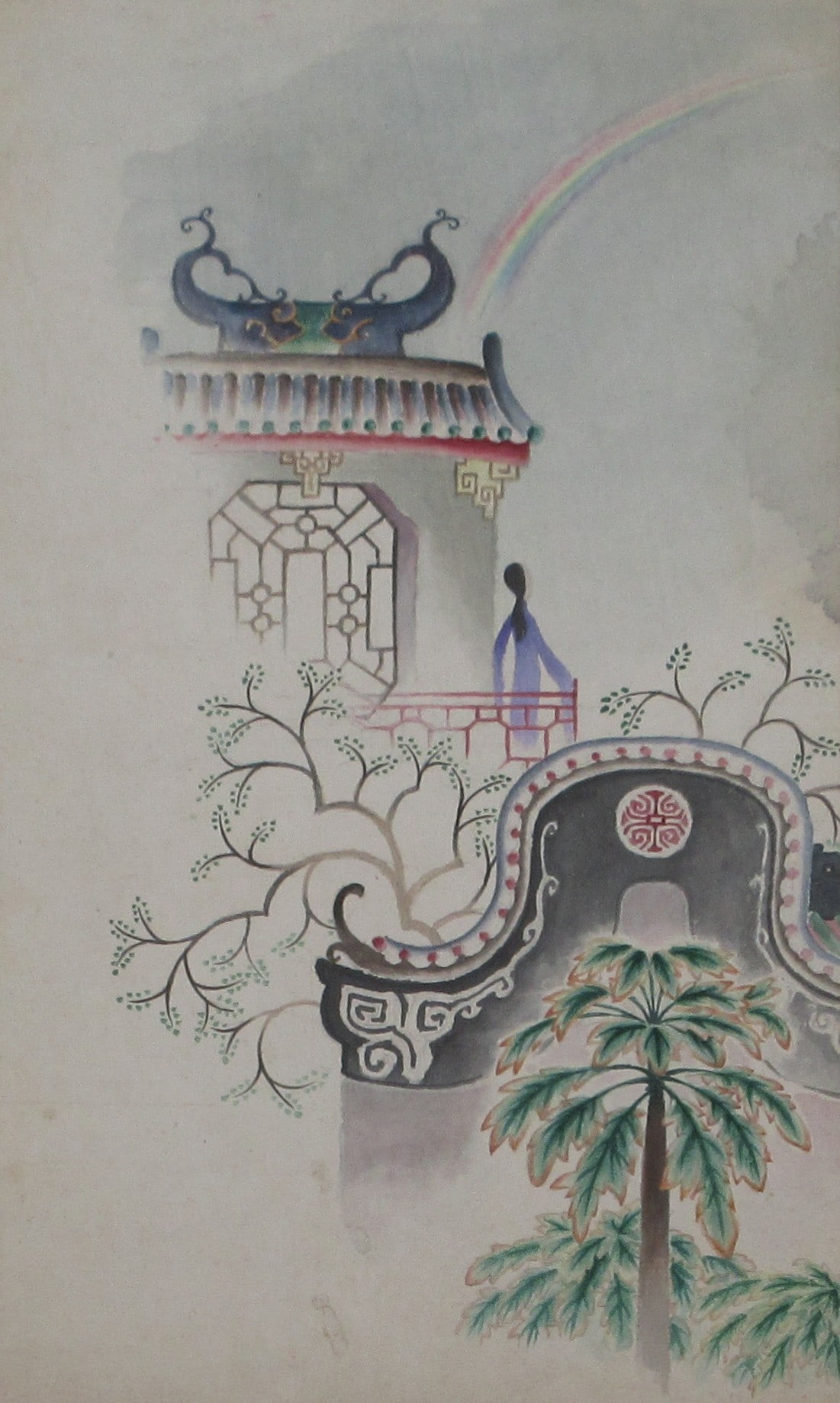 A figure on a balcony peers up at a rainbow, surrounded by decorated structures and stylized palm trees and other plants. Mounted in a mat board frame. The painted areas might extend beyond the frame.