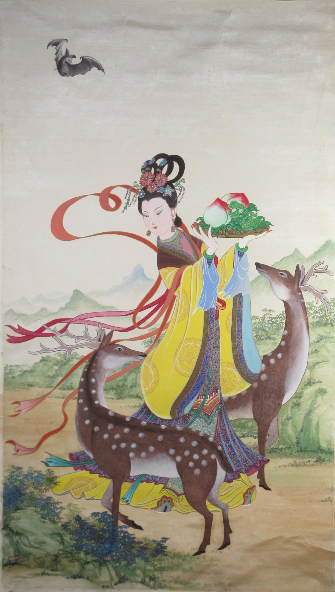 Tu-Aunqua decorative painting of a woman among symbolic creatures. A bat for good luck or fortune. The deer and peaches for longevity and immortality. Mounted on a brocade bordered scroll.