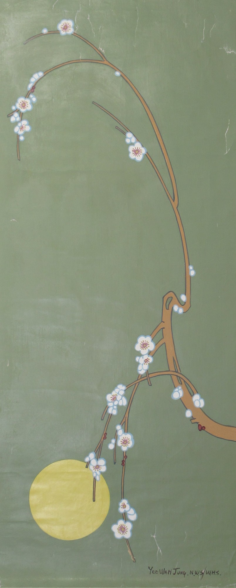 A sparsely blooming branch with a yellow moon. Mounted on rice paper.