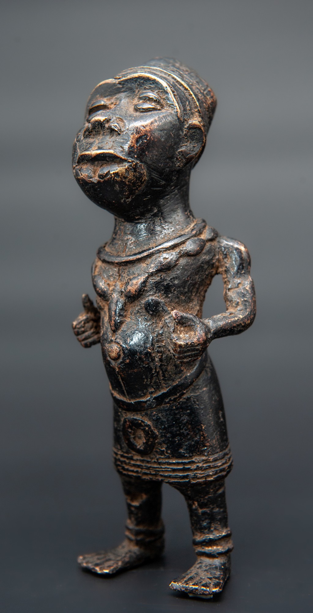 Bronze figures from Benin representing a courtier. Unique piece with profusion of details. The Benin City artists were organized into corporations living in opposite neighborhoods. These corporations were called Iguneromwo, and the one that worked the ivory Igbesamwan. Members of these societies have continued to produce magnificent statues, heads, plaques, ceremony bells, and other figures to this day.