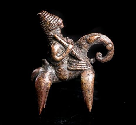 Sao / Kotoko horse ride in African bronze. The horse and the rider are frequently represented in African art. Especially in the north and the west of the continent, these animals are totemic and are associated to prestige. The horse in this statuette is stylised, the horseman is wearing the headgear of this region. The statuettes comes from a private collection in Belgium and is dated 1940 to 1950.
