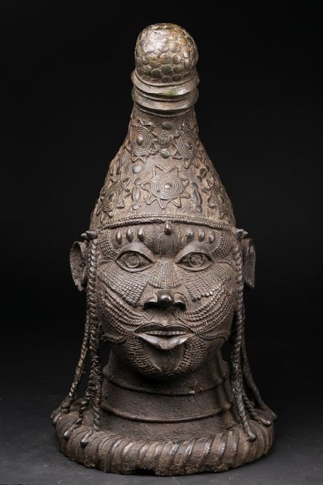 The bronze head has facial scarification, is life-size and very realistic. This style of heads was probably intended to be placed on the palatial altars of deceased queen mothers. Unique piece produced with the lost wax method. Good condition, used with visible signs of wear.