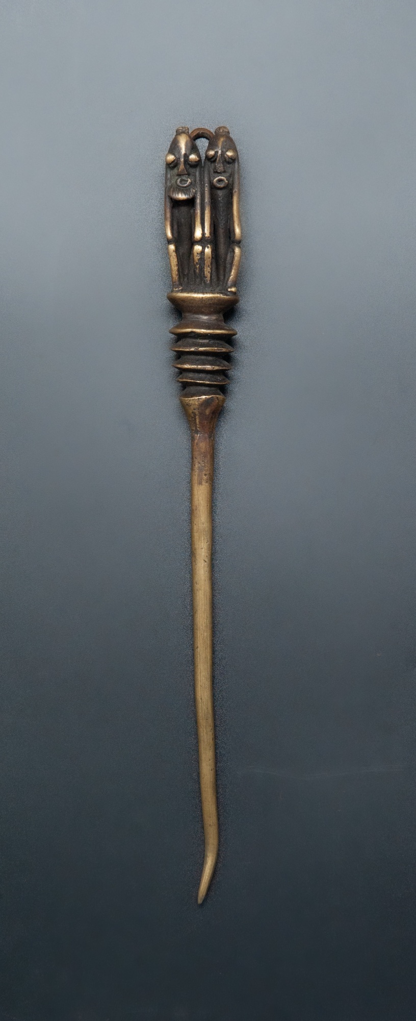 This fine old bronze hairpin from the Dogon tribe in Mali shows a seated couple symbolically connected to each other. The Dogon are famous for depicting the human form with an ovoid head and squared characteristics seen in these remarkable pins.
