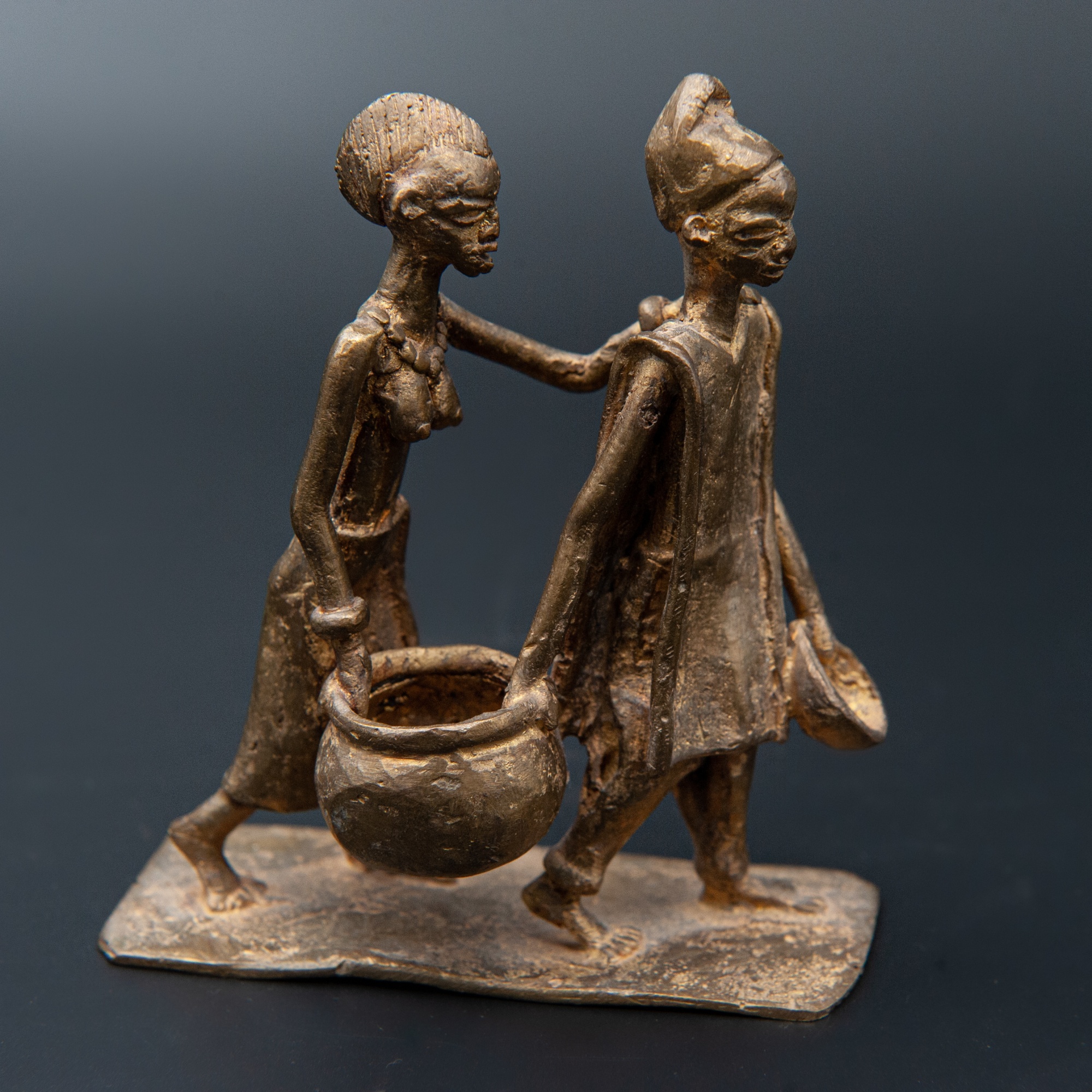 Statue of a couple carrying water, purchased in situ from the well known bronze artist family Dermé in Ouagadougou.