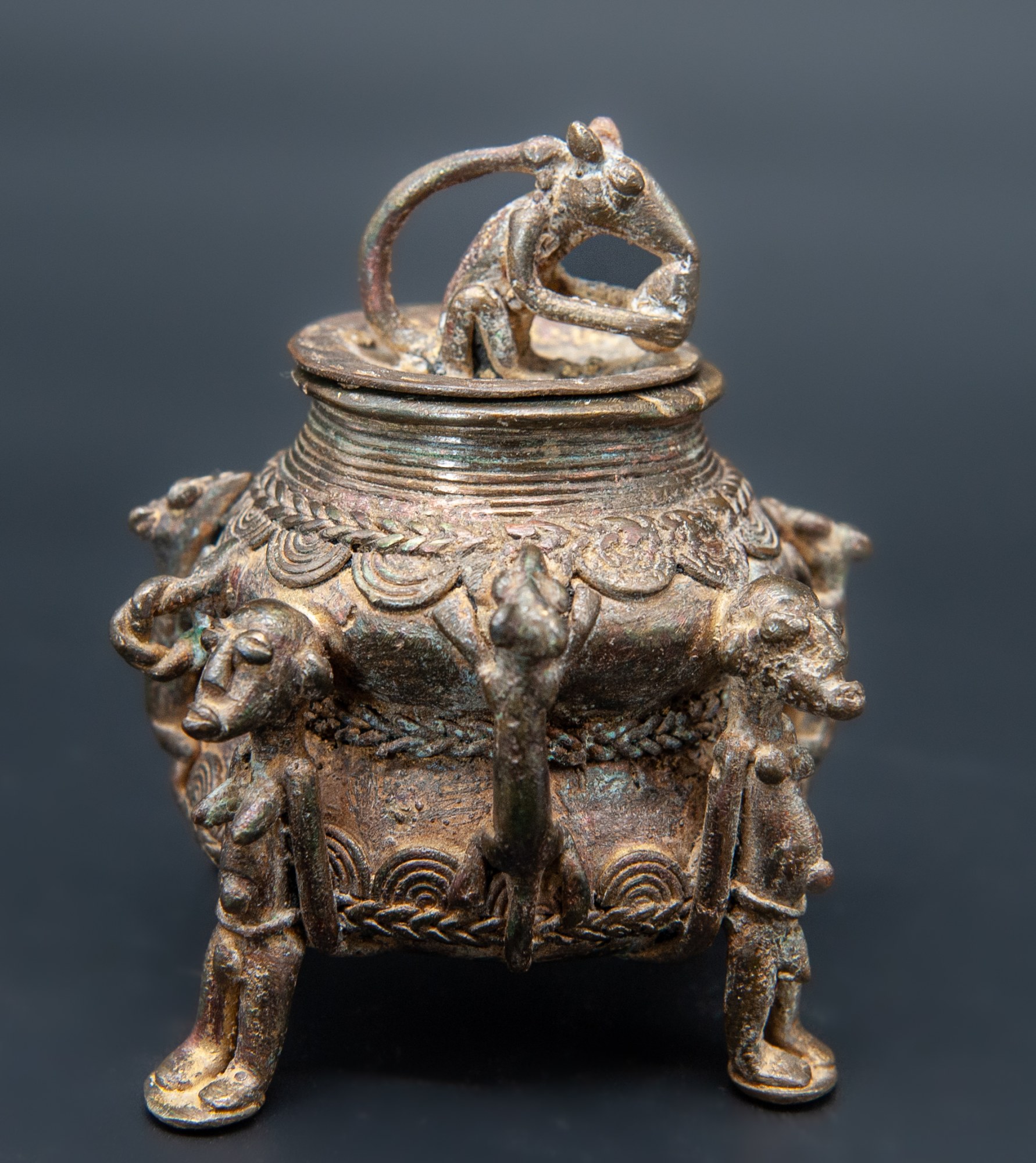 Bronze Baoulé box with beautiful details. The container is supported by four character, on which four mice rest. The lid is also materialised by a mouse. The animal is considered as mystical among the Baoulé tribe. Lost-wax work of remarkable quality.