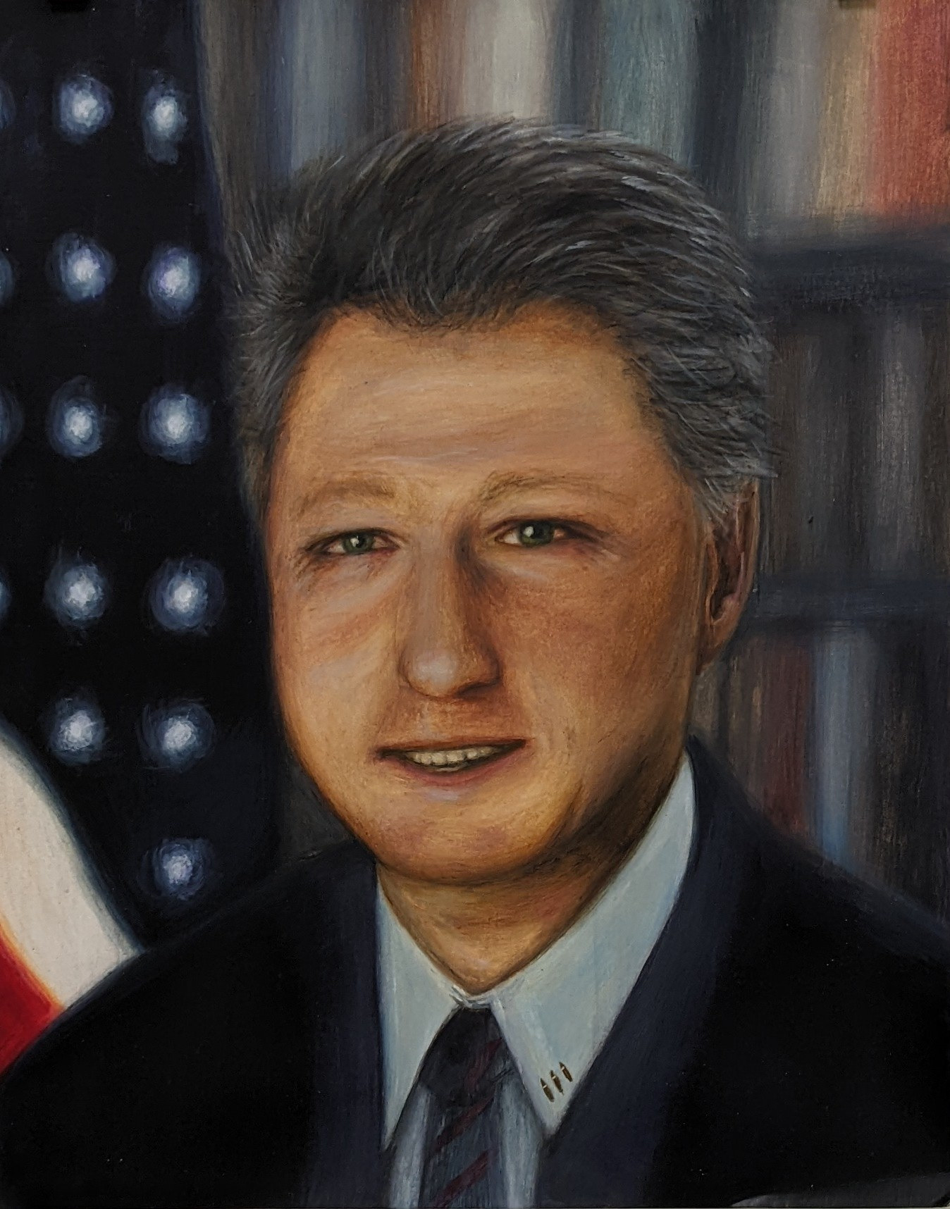 “The 3 Strikes Law (the 1994 Crime Bill), designed as a crime deterrent, serves to prove how inadequate the “rehabilitation” system is. A third offense is indicative of two missed opportunities to help someone rehabilitate, resulting in yet another soul lost in the system. Rehabilitation is not putting a person in a box for life. It is helping that person realize why they did what they did, who they harmed with their actions, and replacing those behaviors with prosocial thoughts and beliefs. I wanted to weave these ideas into President Clinton’s portrait, as he was instrumental in the passing of this law. I wanted the symbolism in the piece to be subtle, hence the three small cigars on his collar and intentional blurring of the American Flag, but once you realize them, you can’t look away.”
