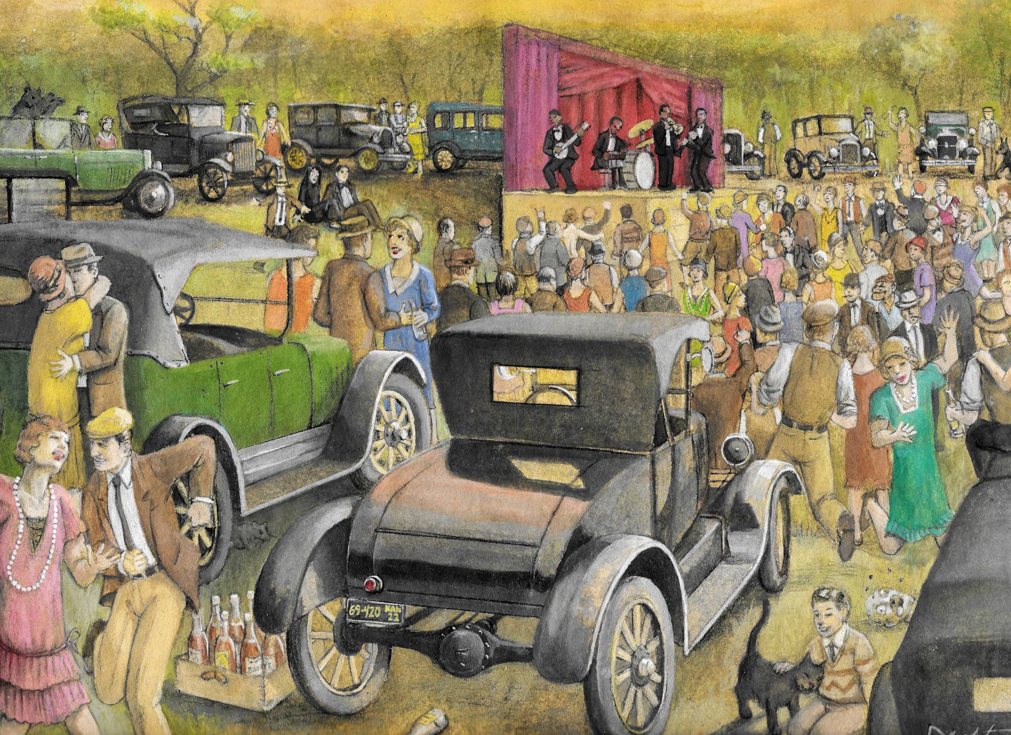 This picture takes place in the summer of 1928 (That’s the latest model year of all the cars pictures.) The black cat symbolizes the bad luck the country will face in the following years of the Great Depression. Before 1929 however, it was party time. Prohibition made people want to drink all the more, so I wanted to picture some alcohol fairly prominently. Consequently, I think I’ll title it “A 20’s Woodstock.”