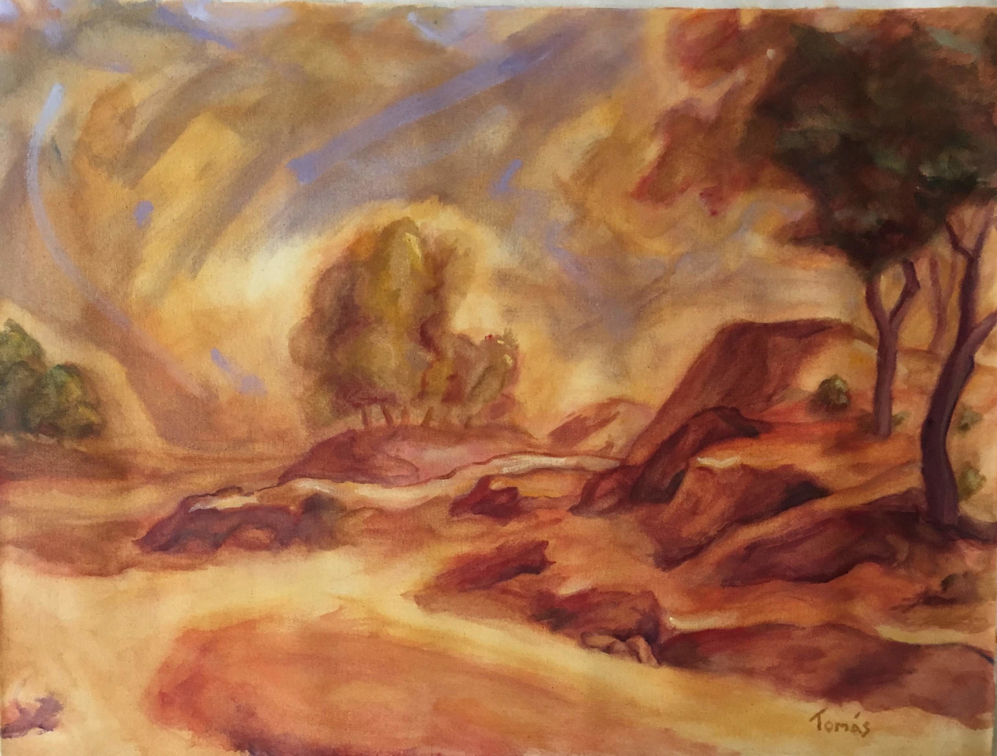 This painting is derived from a 17th century chalk and ink drawing from the Northern Netherlands. Even though I have never been there, I immediately felt a connection to the somber landscape. I used colors in this painting as a way to express my emotional state while living a life of both self-imposed and forced isolation from normal society.