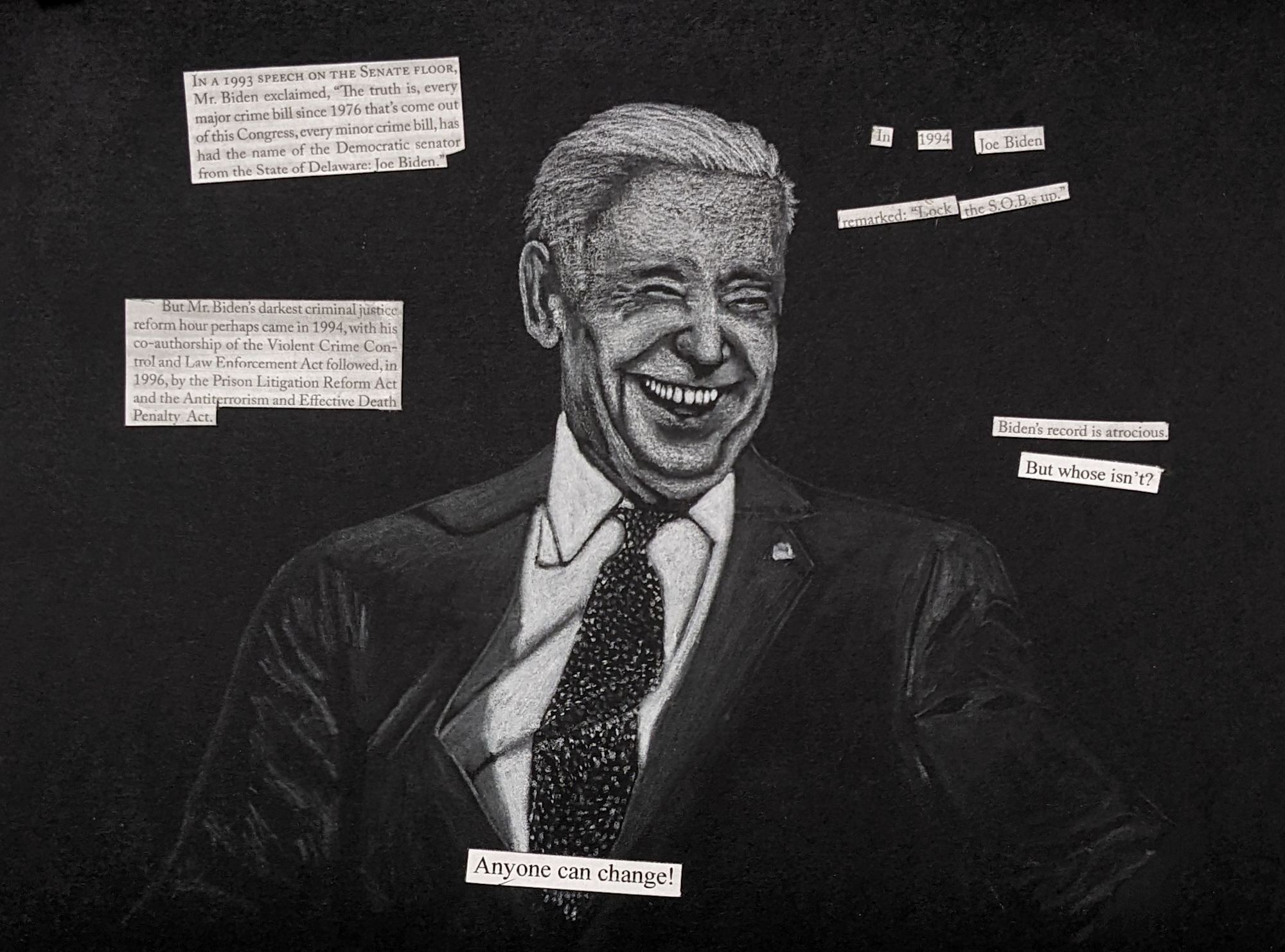 I chose to do this piece of our President, Joe Biden, because he reminds me of many modern prisoners. Much like how ex-con’s records haunts them as they try to move forward in society after their release from prison, I can only suspect that some of the decisions and comments Mr. Biden has produced some struggle for him as well. President Biden has played an integral role in shaping our modern justice system through various bills over the years. He now has the power to undo some of those mistakes. I believe the president has had a true change of heart and that prison reform is on his mind. I believe I can speak for literally millions of prisoners and their family when I say, “now is the time for action.” Anyone can change.