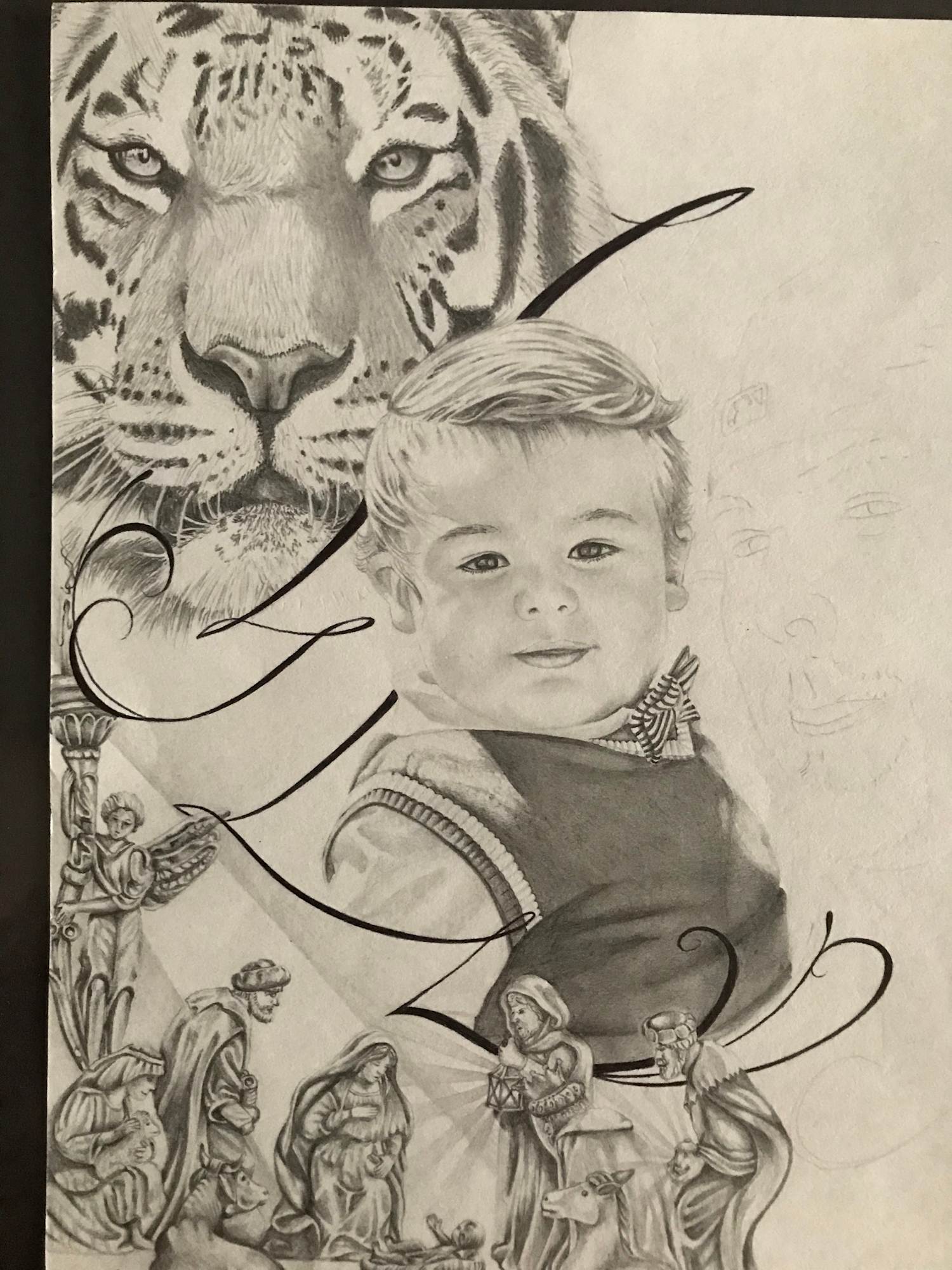 "The drawing with a baby on a lion- that my daughter. It says “protected by many.” The lion is me and at the time I was still active in gangbanging and I was known by everyone in the streets of Long Beach. So everyone knew who my baby girl was and she was protected by everyone."