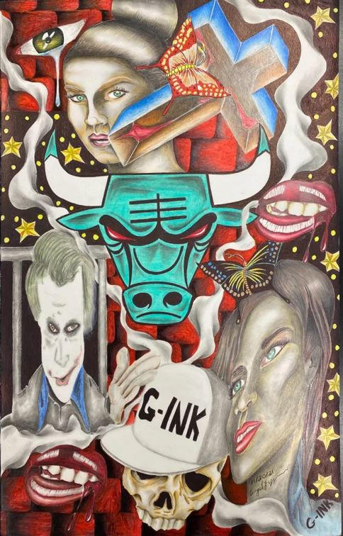 I’m depicting the Chicago Bulls, my favorite basketball team since I was a kid. I wanted to show the pain of women and men in the world. The bricks represent the streets, the smoke represents pollution, and the stars represent the universe. The Joker represents the people who are not doing the right thing. The lips represent the blood that we spill in war, and the eye represents the suffering of the world. G-INK is my artist’s label, and the skull means that it will be my label until I die.