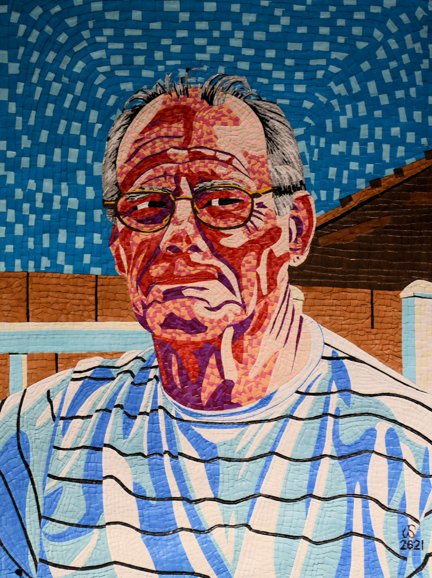 This piece is made from paper on paper, scraps cut and glued to the surface. In high school the art teacher had a project at Christmas time in which we art students had to cut out (solid pieces) and glue together cartoon characters to be hung in the hallways. Each one represented a student. My first year I did a terrible job, but thereafter I loved it. I remember making a Cereberus the Aardvark (a comic book figure), among others. In prison, some years ago, I tried to adapt the idea to portraiture, though it didn't work as well as I had liked, trying to cut solid shapes into an accurate likeness. After a while I collected what I initially thought was useless scrap. Boy, was I mistaken! After a couple of experiments I took the construction paper idea to a new level, and, voila, Bryon's Dad appears.
