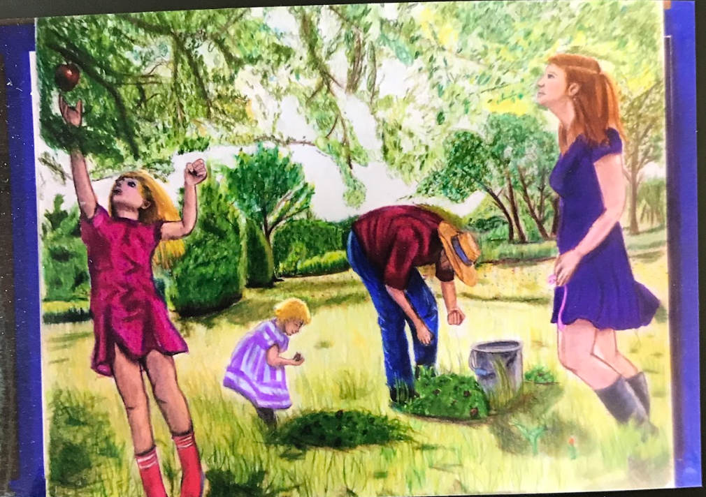 My story - Adam and Eve are out toiling with their daughters - picking strawberries for a pie, because Eve is teaching her daughters to bake and strawberry is Adam's favorite. Their oldest sees an apple in a tree and it looks good to eat, so she tries to get it. Eve looks on and is fearful, because she remembers what happened when she did the same thing and is about to warn her.