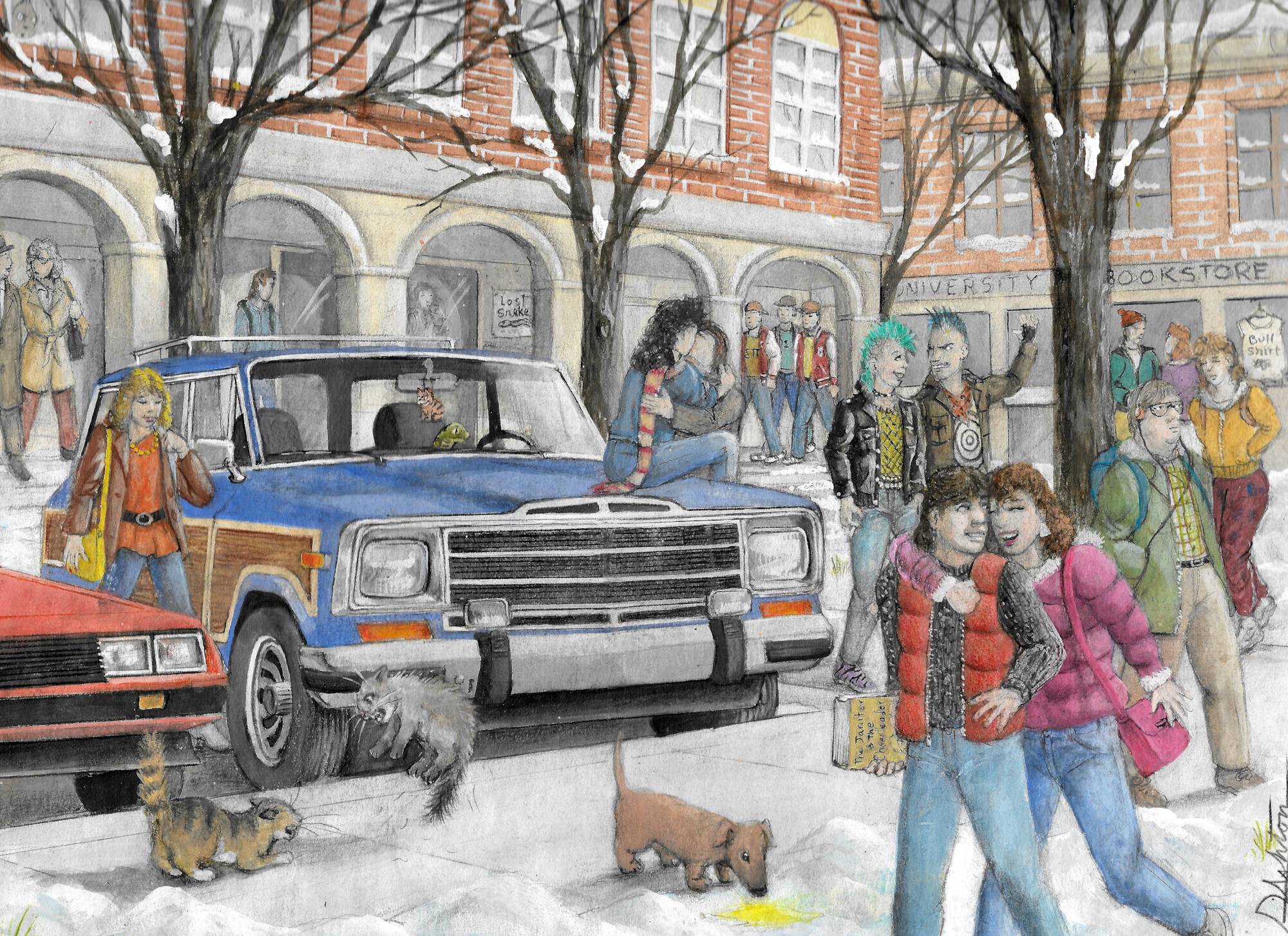 When I do these pictures, I like to immerse myself in them. I like to feel that I’m in that setting. When I do one set in the 70’s or 80’s, they're fun to do because they bring back a lot of memories. This is especially true with this one. I went to college in the 80’s and doing tis picture made me very nostalgic. I just felt like making it a snowy landscape. I have a lot of good memories walking around campus with friends on a cold, sometimes snowy day.