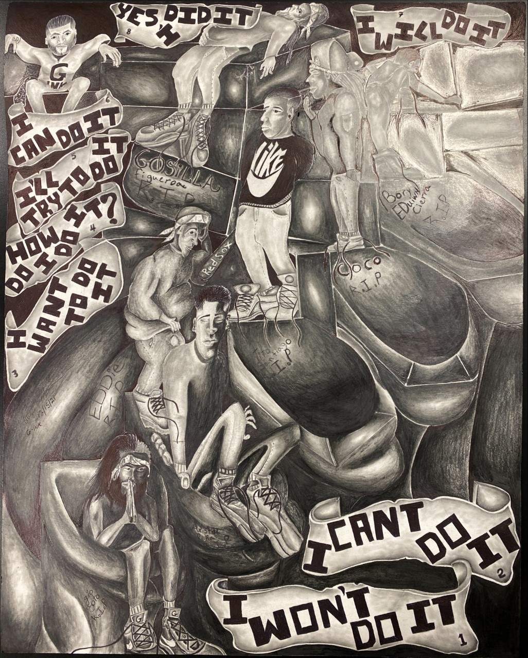 This piece is all my friends that passed. I am going to start with G., and he was my brother from another mother. He committed suicide when he was 21 years old. They’re all are my childhood friends. A. was also my brother, he got in a car accident with me and died. There are more, all I am doing is a picture to keep them alive for ever. I also mean that in all I’ve been through in my life, I got to get away from the street.