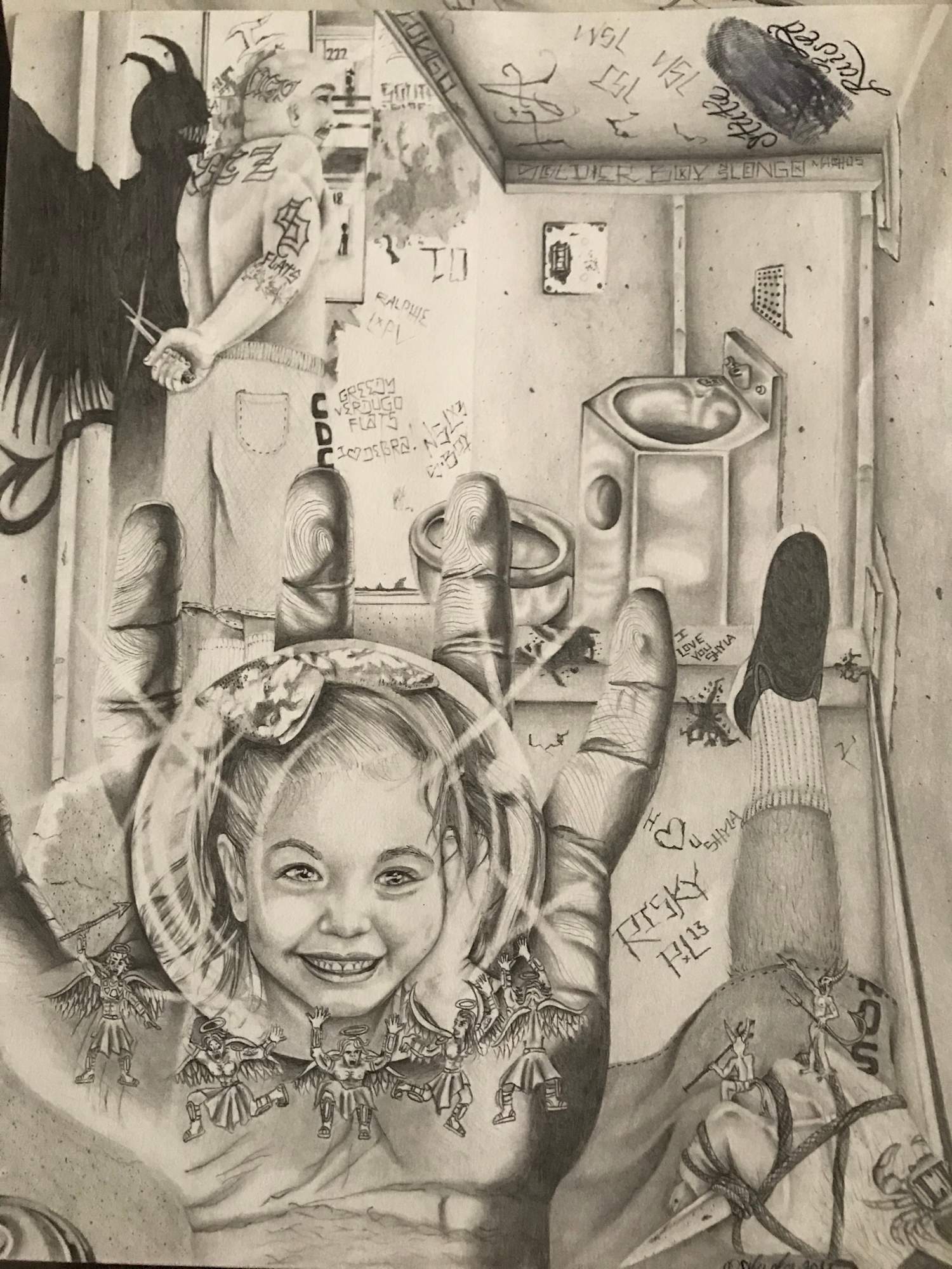 "The drawing of a prison cell, with writing on the walls, a hand holding a mirror and man with the shadow of a devil- If this is the one with me on the bunk holding a knife on one hand that was wrapped around my hand so it would not fall off when in use, the demons are on that hand. The other hand is full of little Angels lifting up a Crystal ball showing me a picture of my daughter telling me not to do it. The other guy was my celly at the time, his name was (greedy). I drew him standing there as he is holding a knife behind him and his shadow is a demon against the wall. If you look out the window, there's another man up the stairs. You can see him throwing up a āLā with his hand, pretty much telling me to take care and handley you bizz. And it says 5 minutes till day room. This drawing was based on a true story, as a riot between us (Mexicans and the (Blacks) were going to crash out. And it was going to happen during day room time. Thanks to God, it was squashed. No riot happened but the one inmate that started everything got beat down by his own people (Blacks) to settle the matter. In other words, he ended up leaving the Unit full of blood. So that day I went back into my cell after the tower shot about 6 times with a big cannon and 20 cops ran into spray and shoot. I decided to draw