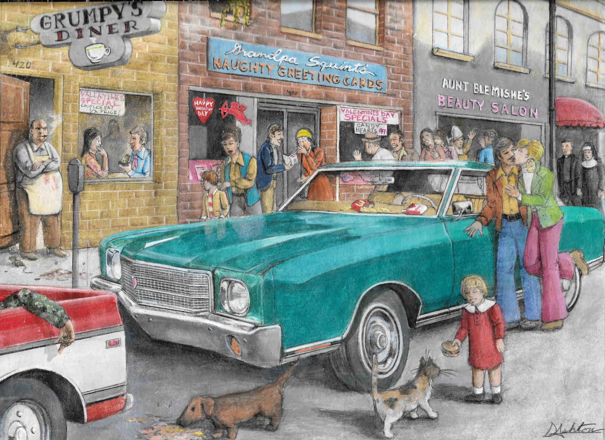 I wanted to make it obvious it's February so I put a lot of Valentine's Day stuff in the windows.The car reference picture I worked from was all distorted.The front was huge and it tapered into a tiny back end. I've seen a lot of pictures like that in car magazines. I guess they think it makes the cars look faster but I just think it makes them look weird and out of proportion. I tried to fix it but the front still looks disproportionately large. I guess it'll do though.The names on the 2 stores to the right of Grumpy's Diner are from the Addams Family show. Sometimes they'd mention a relative of theirs with a funny name like that.